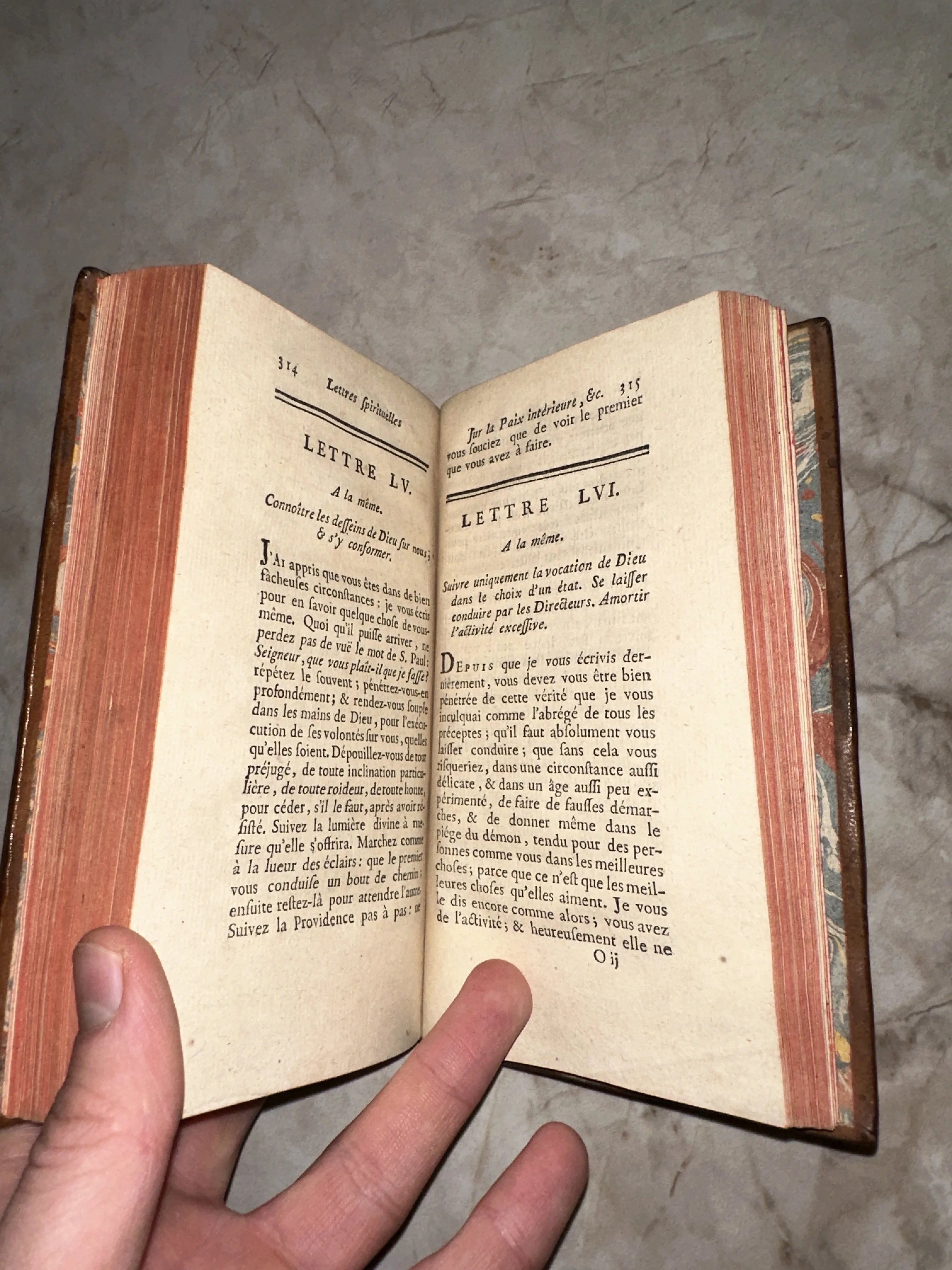 Разворот старинной книги на французском языке с главами Lettres spirituelles и красным обрезом страниц.