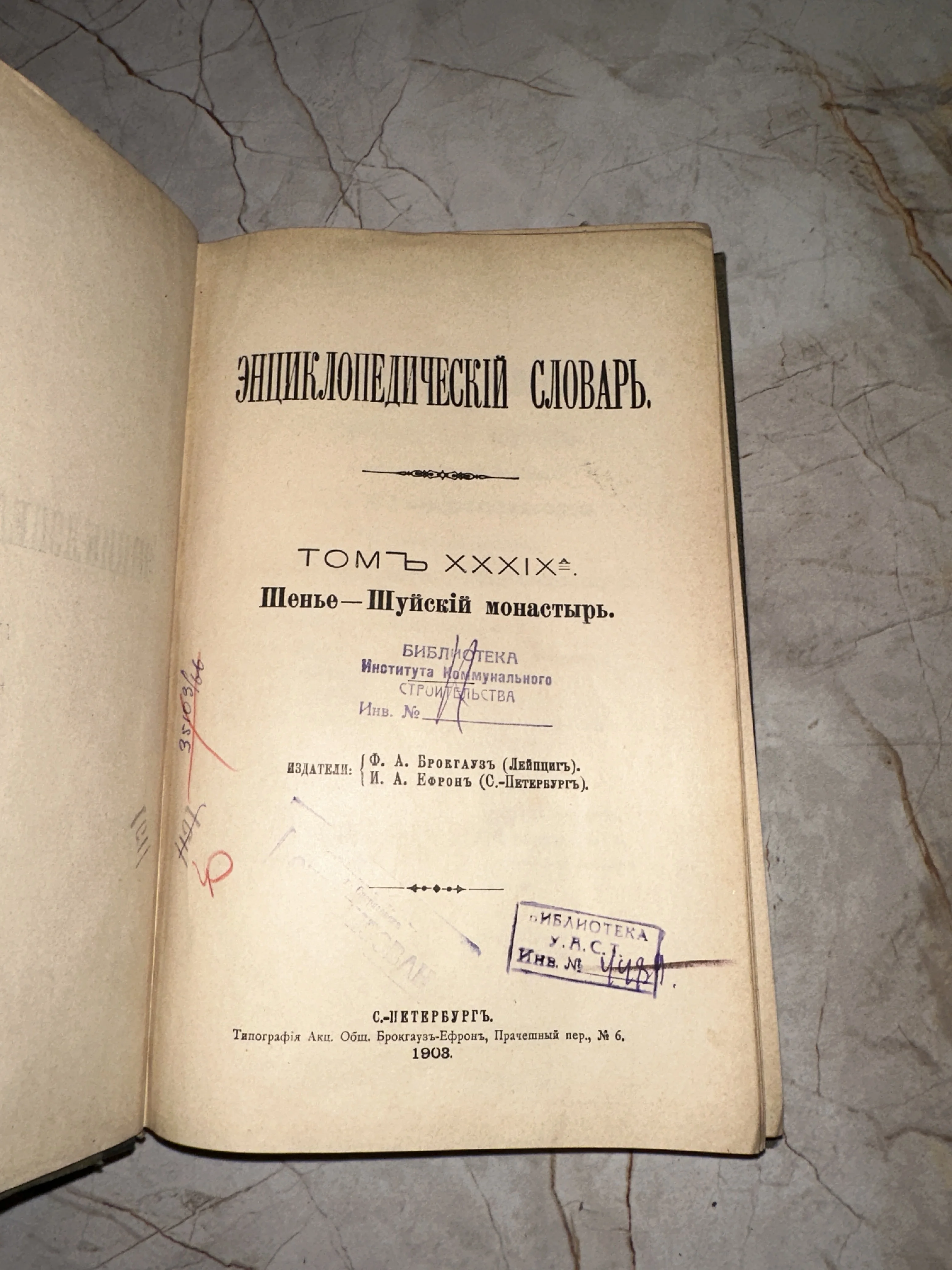 Титульный лист антикварной книги 'Энциклопедический словарь' Брокгауза и Ефрона 1903 года со старыми библиотечными штампами.