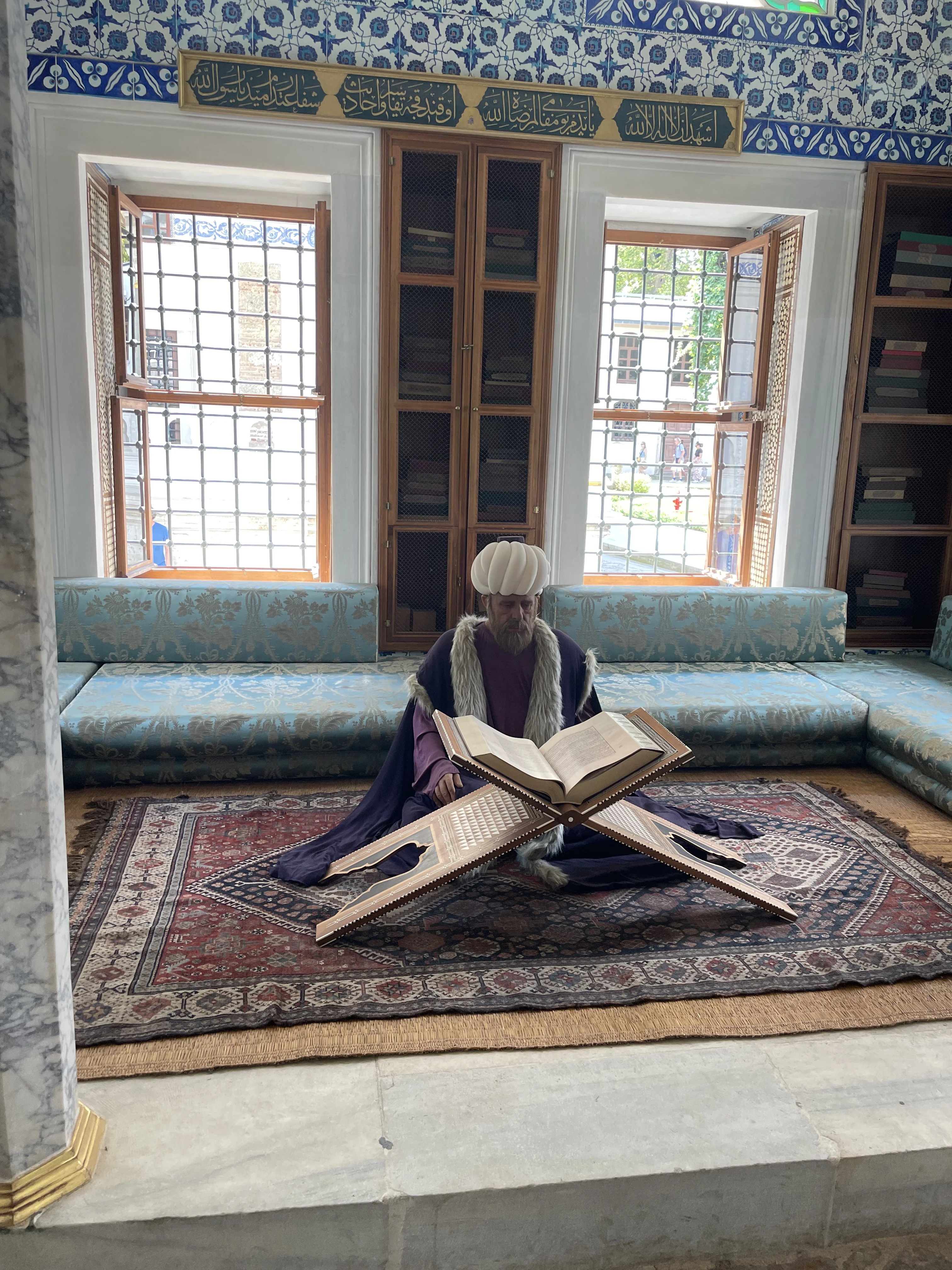 Фигура ученого в тюрбане, читающего древнюю книгу на резной подставке в османском интерьере с голубыми изразцами.