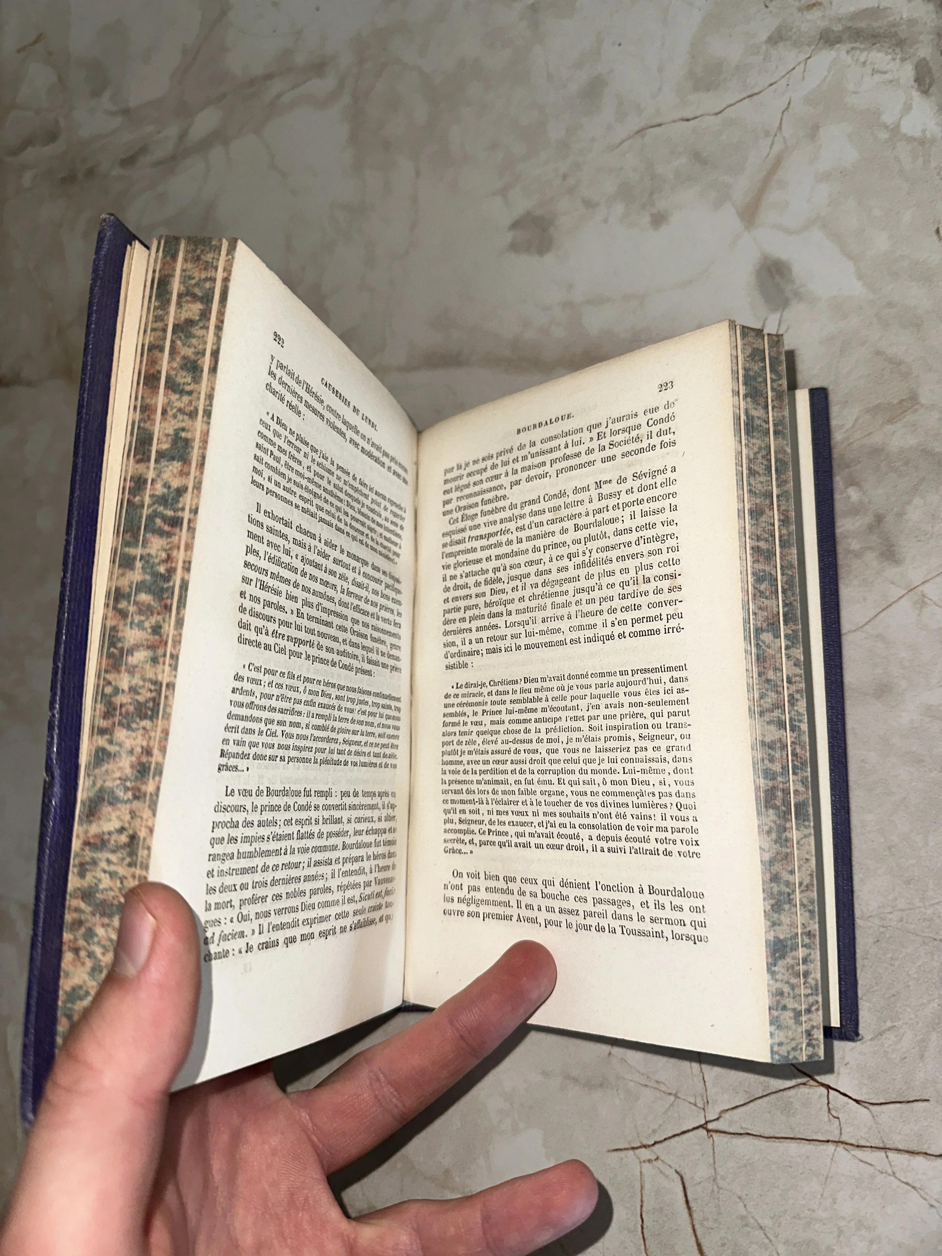 Разворот старинной французской книги со страницами 222 и 223 и мраморным декорированным обрезом.