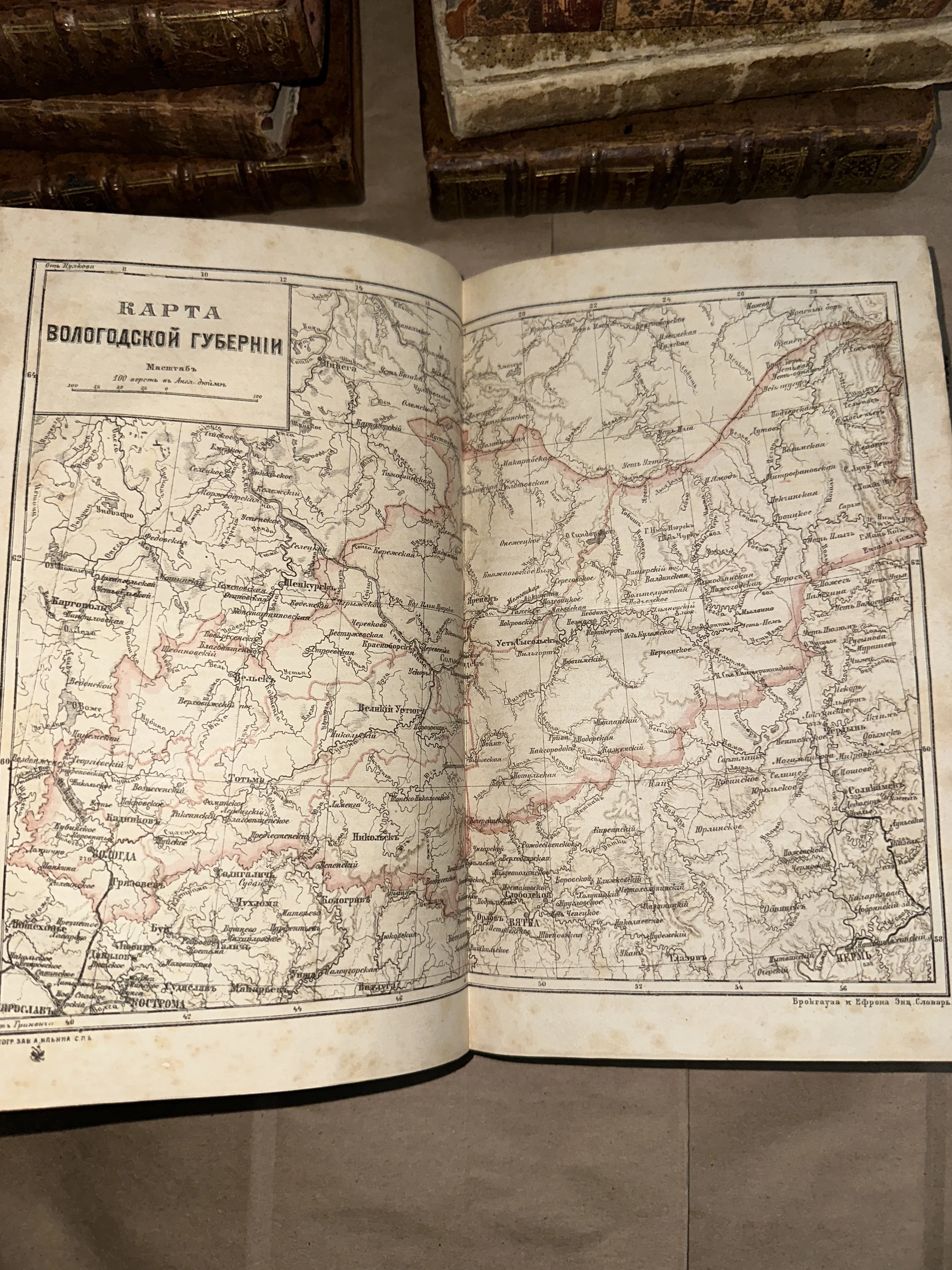 Раскрытая антикварная книга с детализированной картой Вологодской губернии из словаря Брокгауза и Ефрона.