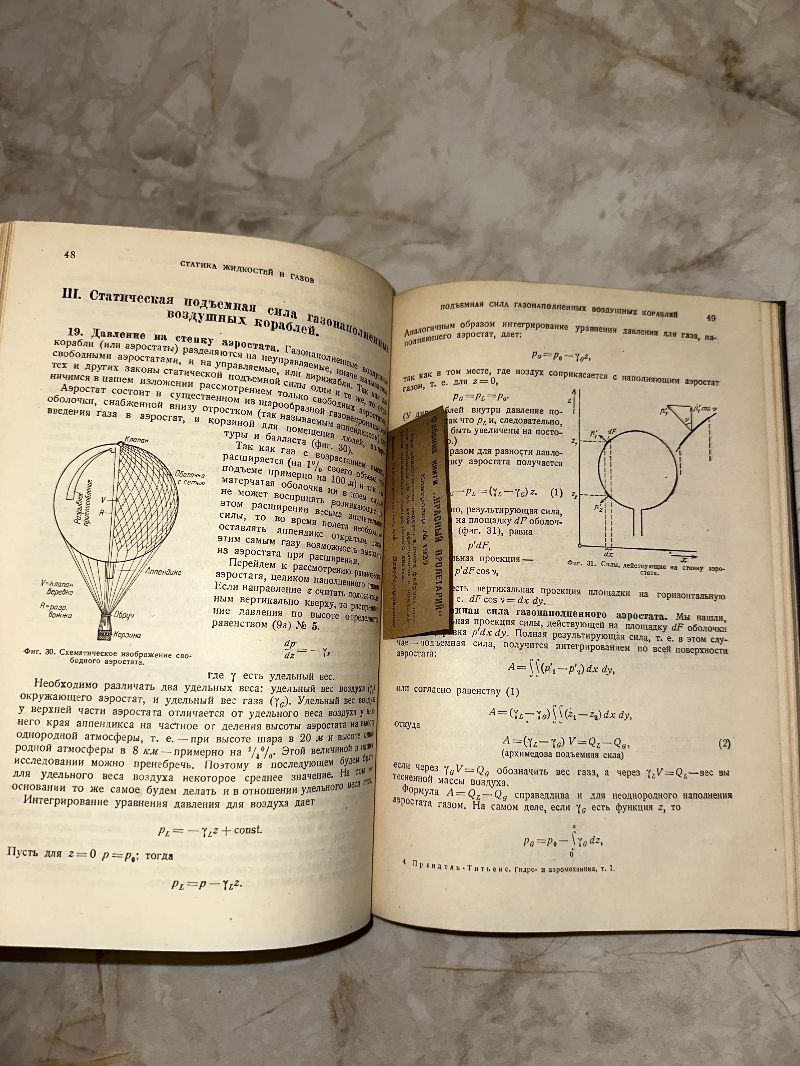 Этот редкий экземпляр советской научной литературы погружает в эпоху становления воздухоплавания, детально описывая физику аэростатов. Сохранность страниц подчеркивается благородной патиной времени, а сохранившийся бумажный ярлык 1929 года фабрики «Красный Пролетарий» делает этот экземпляр уникальной находкой для коллекционера.