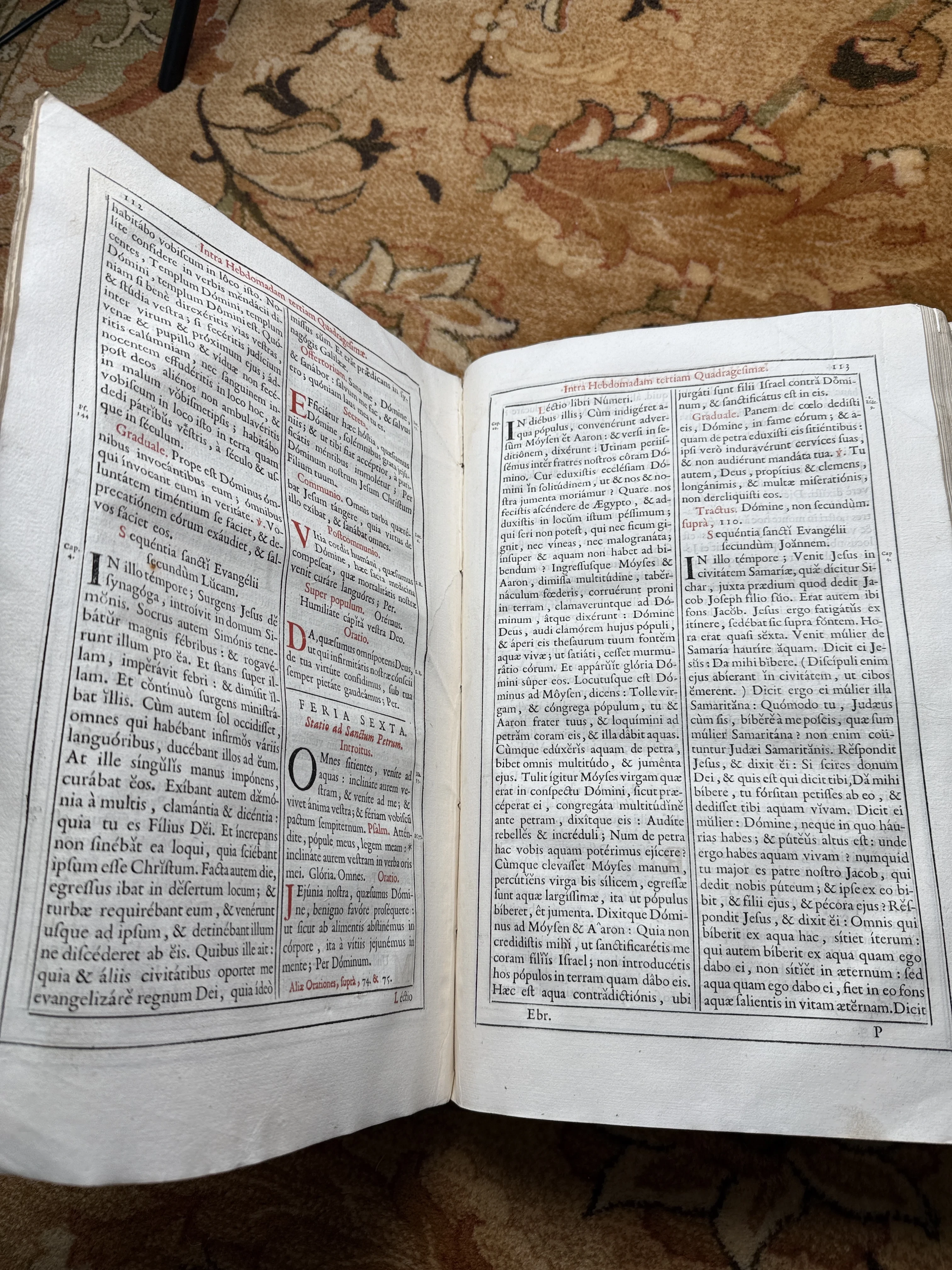 Этот редкий экземпляр хранит в себе многовековую историю литургических традиций, запечатленную в строгих колонках латинского текста с классической двухцветной печатью. Благородная патина времени и характерная фактура старой бумаги подчеркивают аутентичность и коллекционную ценность этого фолианта. Издание станет изысканным дополнением к собранию старинных книг или теологических артефактов.