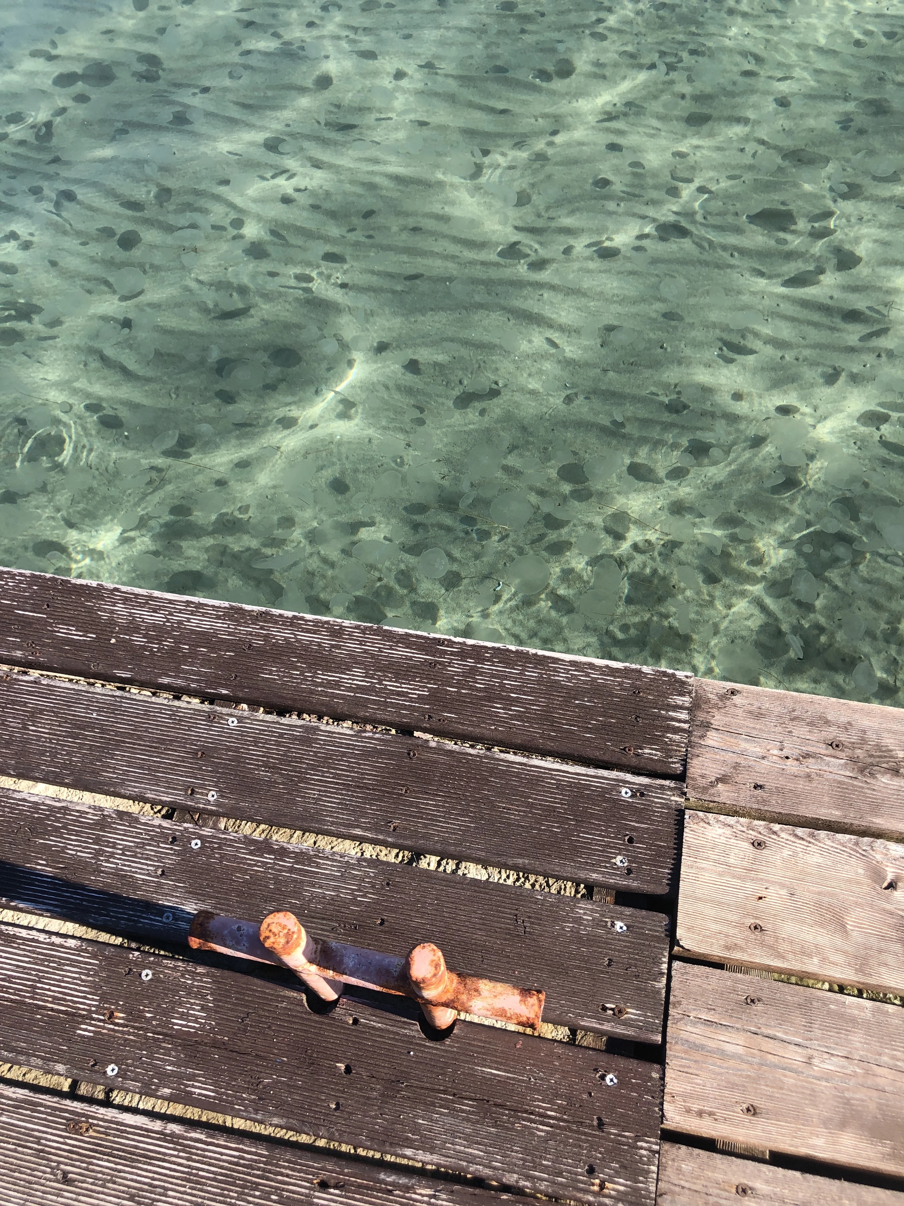 Старый причал и медузы в прозрачной воде