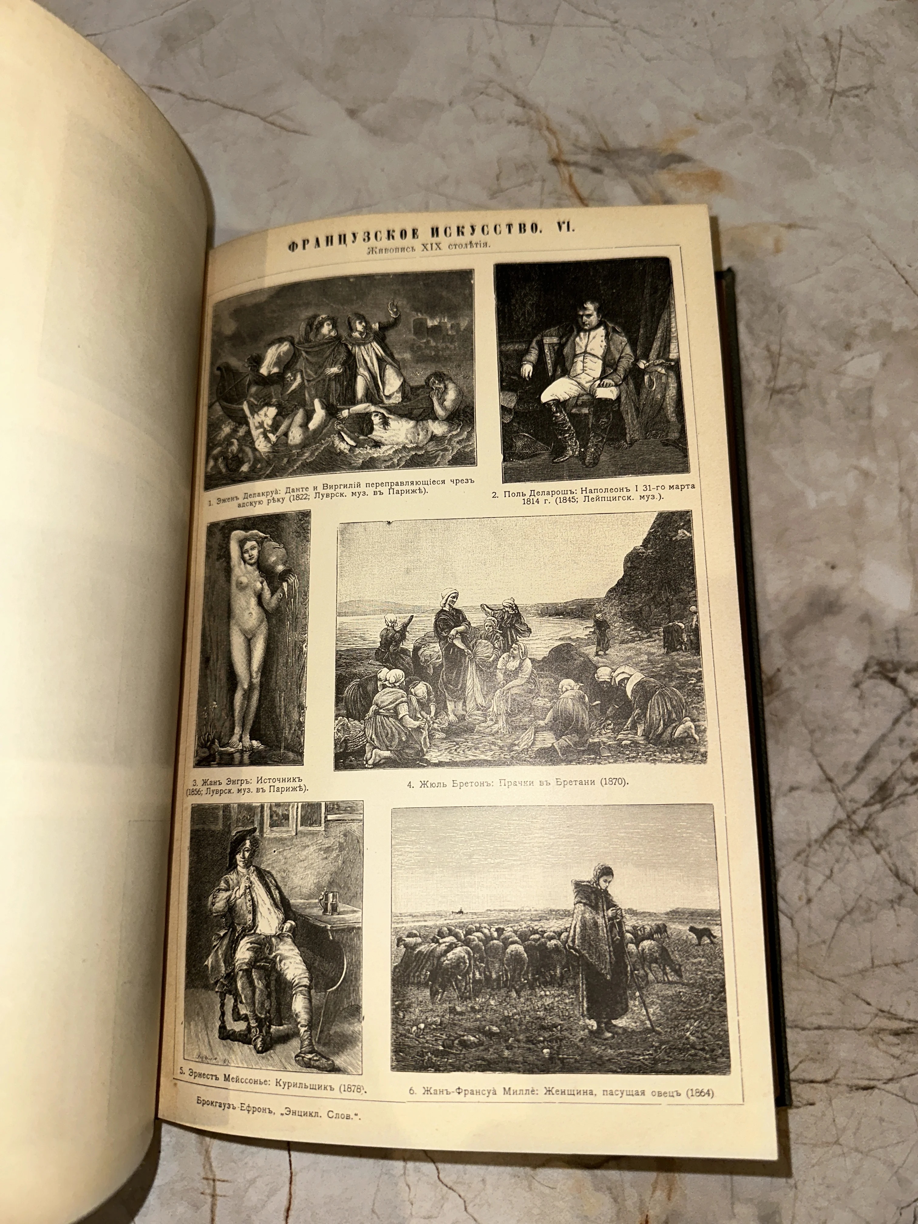 Страница старинной энциклопедии с репродукциями картин французских художников XIX века, включая работы Делакруа, Энгра и Милле.