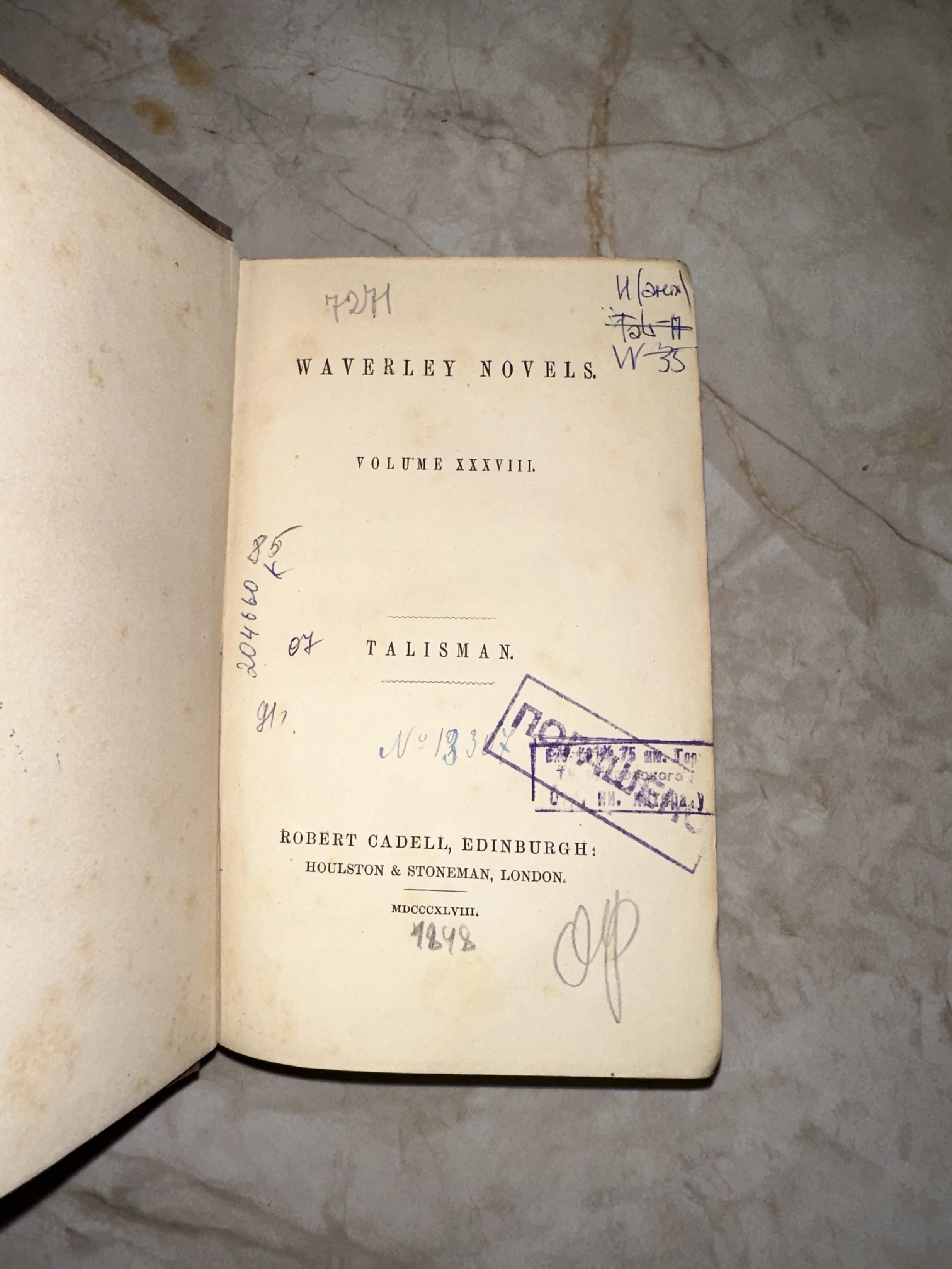 Перед вами подлинный артефакт викторианской эпохи — тридцать восьмой том собрания сочинений Уэверли, изданный в Эдинбурге и Лондоне. Страницы из плотной бумаги с характерным благородным пожелтением украшены рукописными пометками и аутентичным библиотечным штампом, что придает экземпляру особую историческую ценность и индивидуальность. Это издание — не просто книга, а живой свидетель литературной истории середины XIX века, сохранивший дух старой Англии.