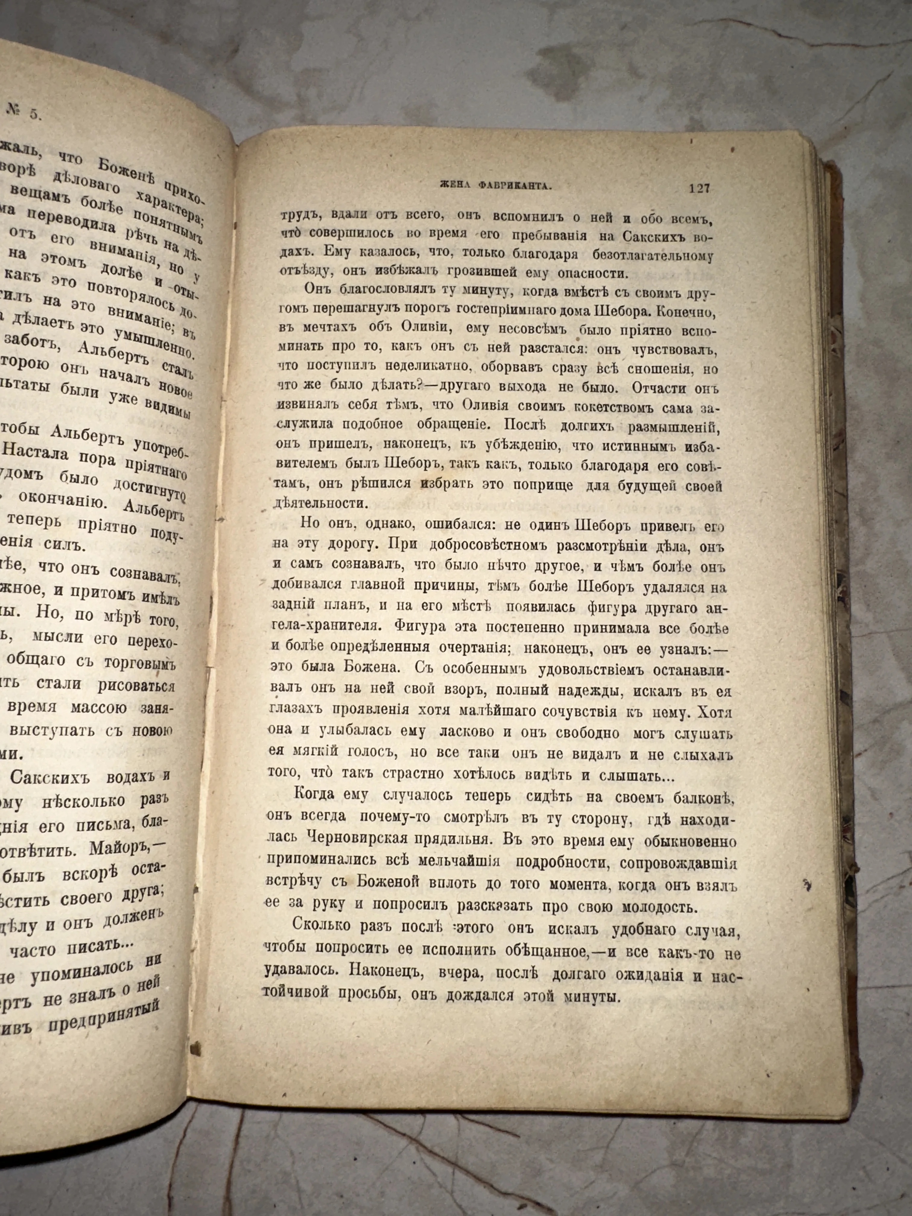 Разворот старинной книги с текстом на дореволюционном русском языке, страница номер 127 с заголовком Жена фабриканта.
