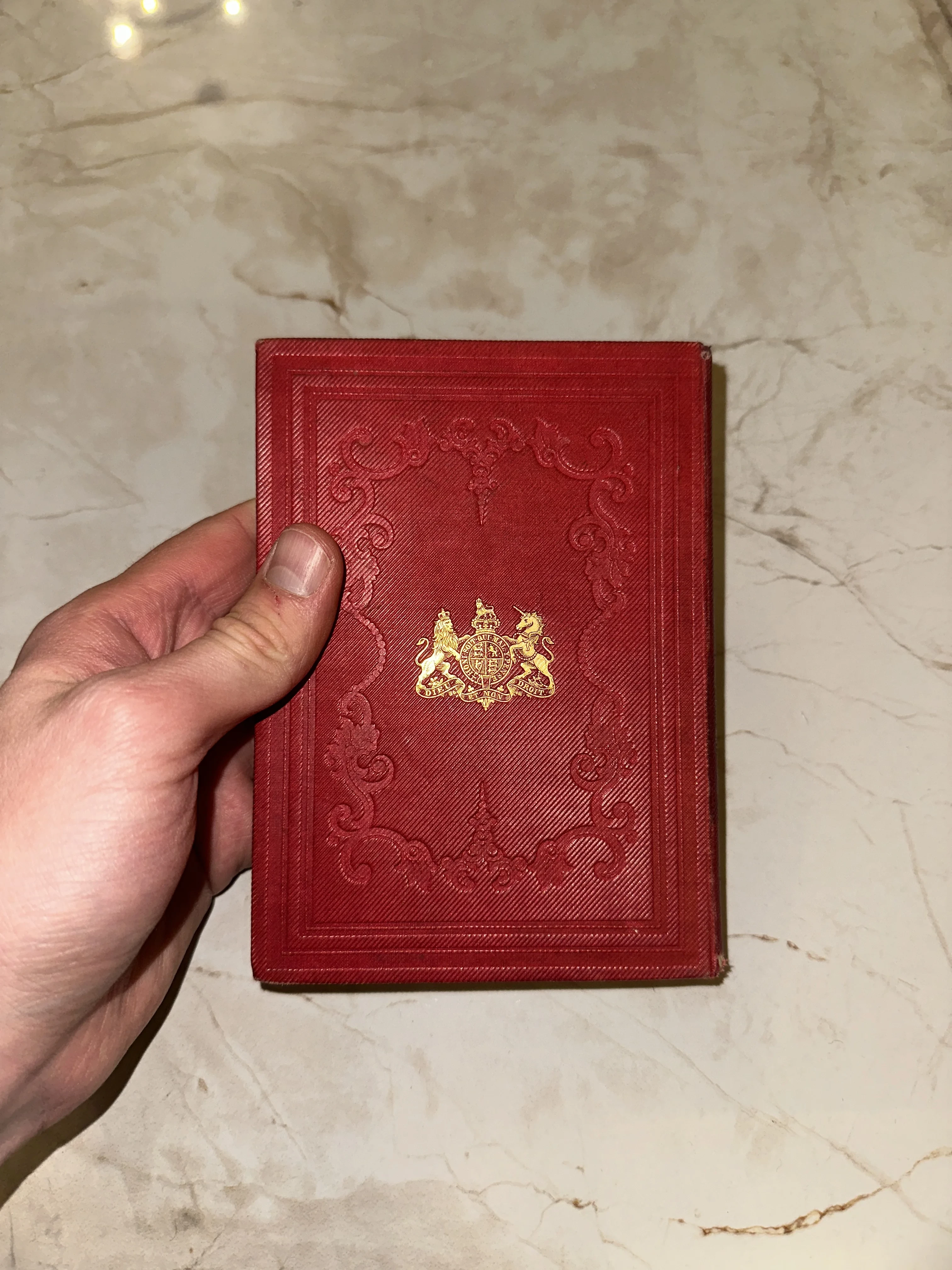 Антикварная книга в красном переплете с британским гербом
