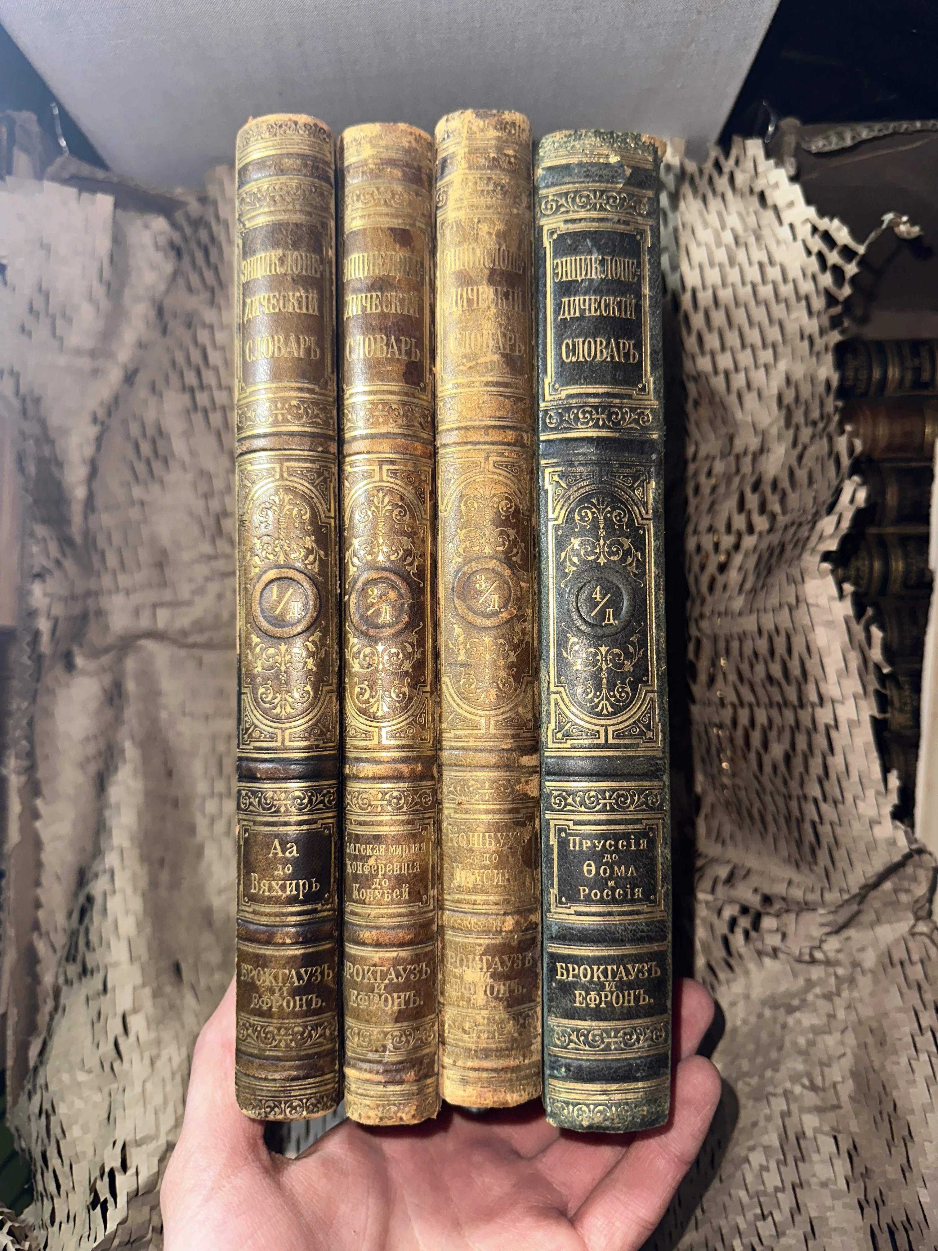Собрание из четырех томов легендарного энциклопедического словаря Брокгауза и Ефрона в роскошных переплетах с богатым золотым тиснением. Благородная патина времени на корешках подчеркивает историческую ценность этого фундаментального труда, ставшего символом дореволюционной русской науки. Идеальный экземпляр для частной библиотеки или оформления изысканного рабочего кабинета.