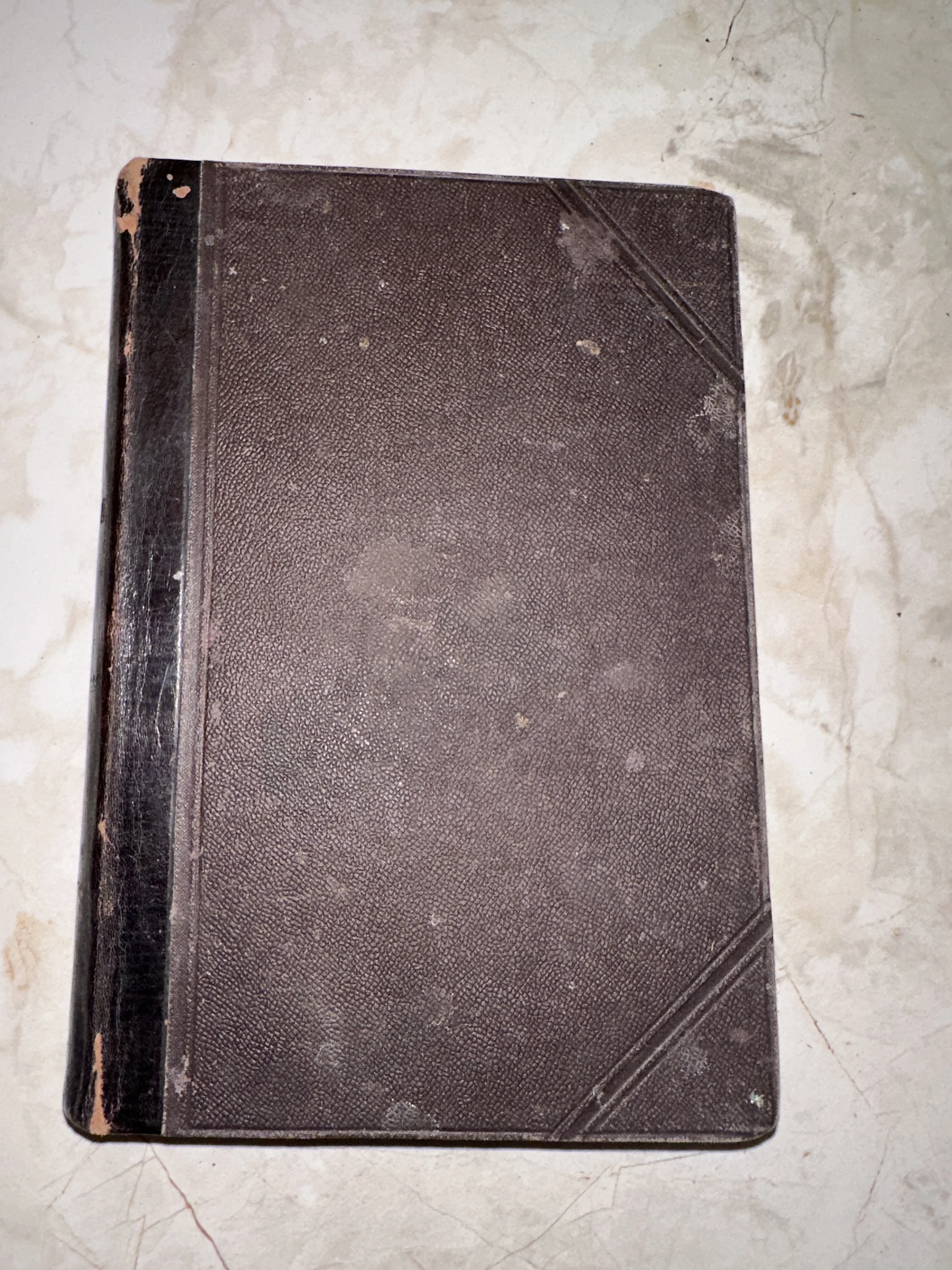 Старая антикварная книга в темно-коричневом переплете с кожаным корешком на светлом фоне