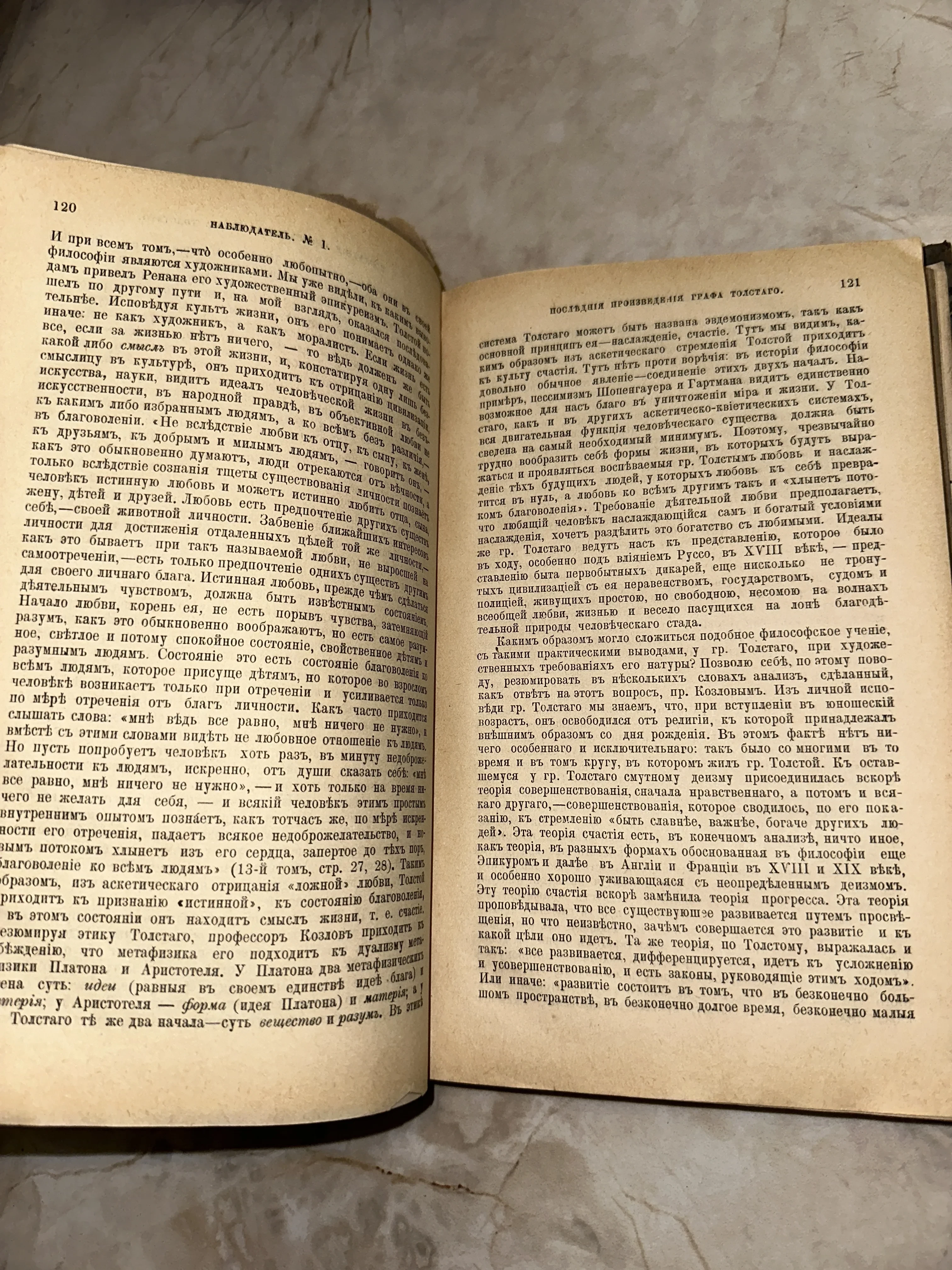 Раритетный разворот литературно-политического журнала «Наблюдатель» с глубоким анализом философии и поздних трудов Льва Толстого. Пожелтевшие страницы с дореформенной орфографией и характерным шрифтом передают атмосферу интеллектуальных дискуссий конца XIX века. Прекрасный коллекционный экземпляр для любителей русской классики и истории книгоиздания.
