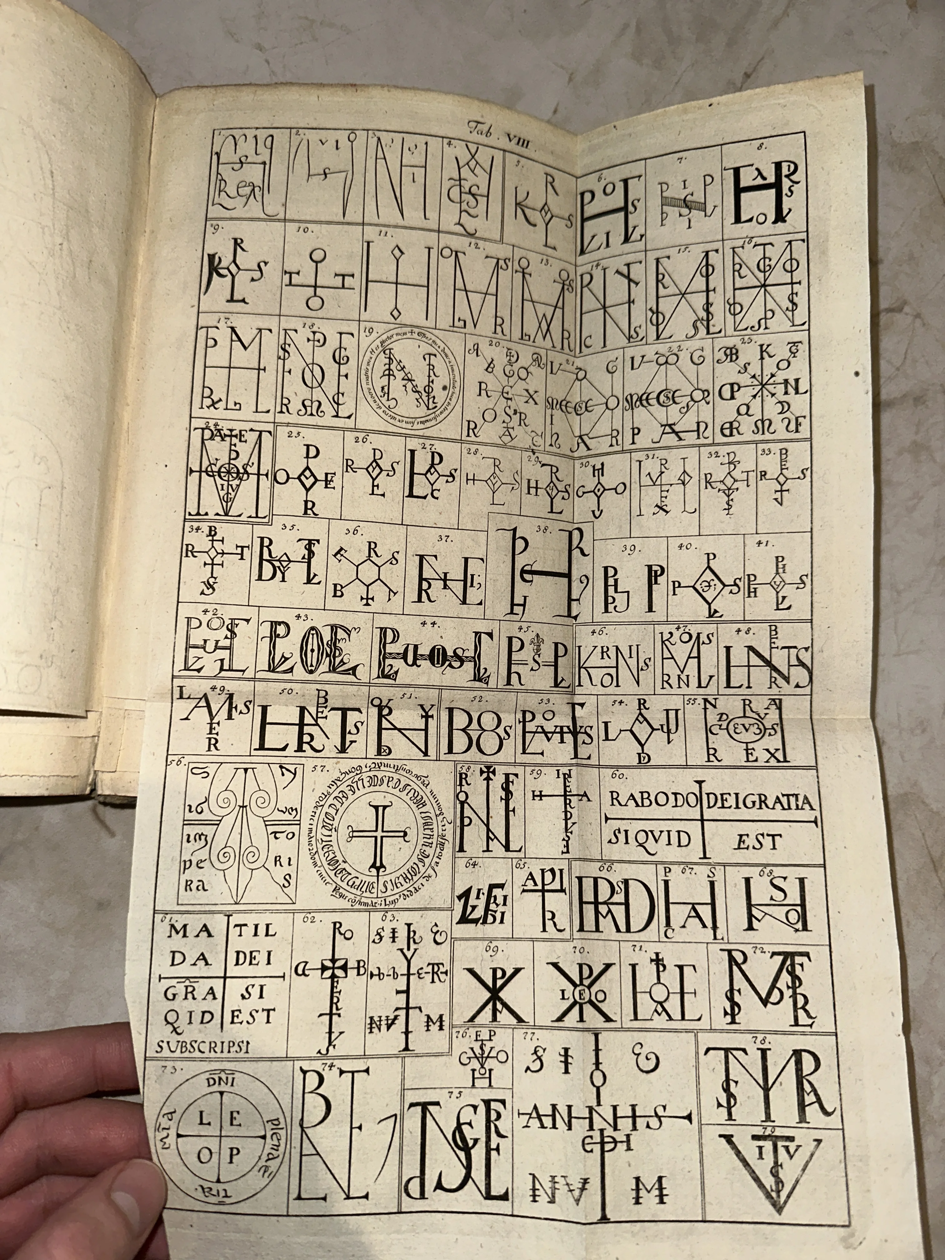 Разворот старинной книги с таблицей пронумерованных графических монограмм, латинских букв и мистических символов на пожелтевшей бумаге.