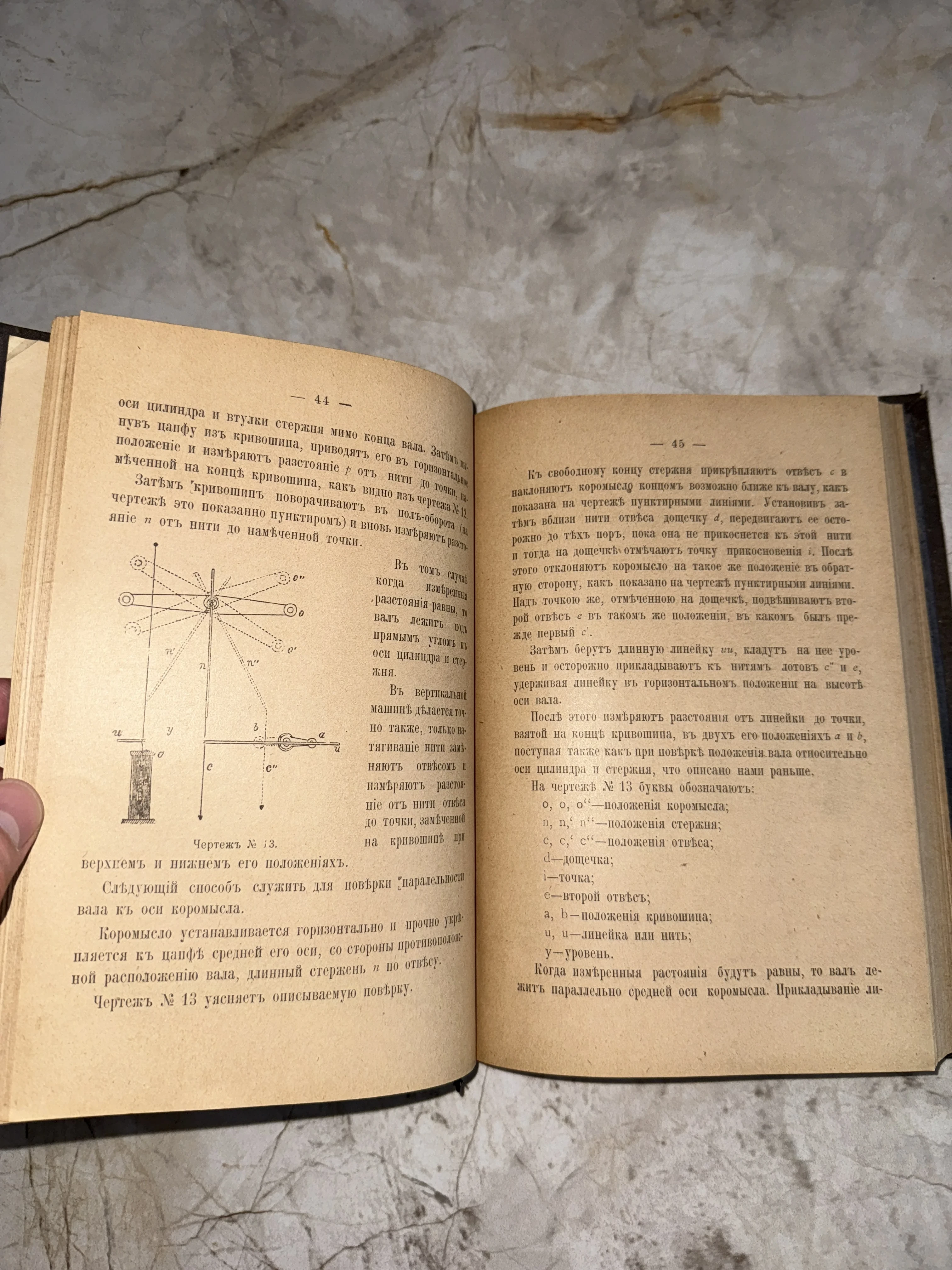 Уникальный разворот из научного пособия начала XX века, демонстрирующий сложное устройство механических узлов. Текст, напечатанный в старой орфографии, и детальный чертеж на плотной пожелтевшей бумаге создают атмосферу кабинетных открытий и инженерной точности прошлого.