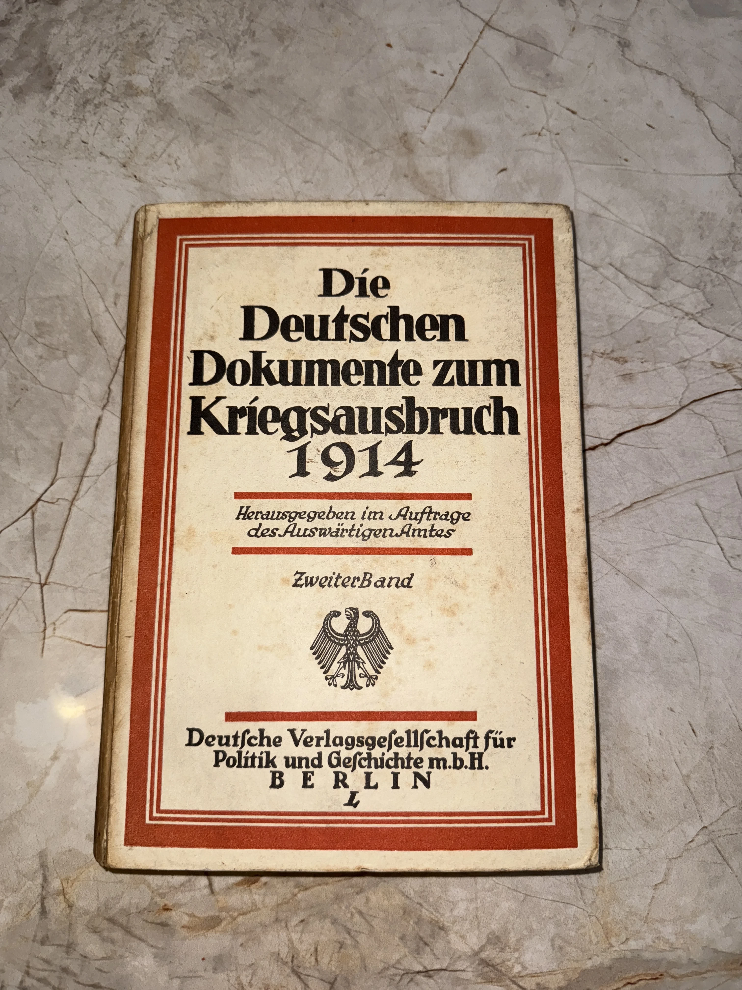 Перед вами подлинный исторический артефакт — второй том официального собрания документов о предпосылках Первой мировой войны, изданный по поручению Министерства иностранных дел Германии. Книга отличается строгой эстетикой начала XX века: контрастная красно-белая обложка украшена гербовым орлом и классической типографикой того времени. Это редкое документальное свидетельство станет достойным пополнением коллекции военной литературы или ценным подарком для исследователя мировой истории.