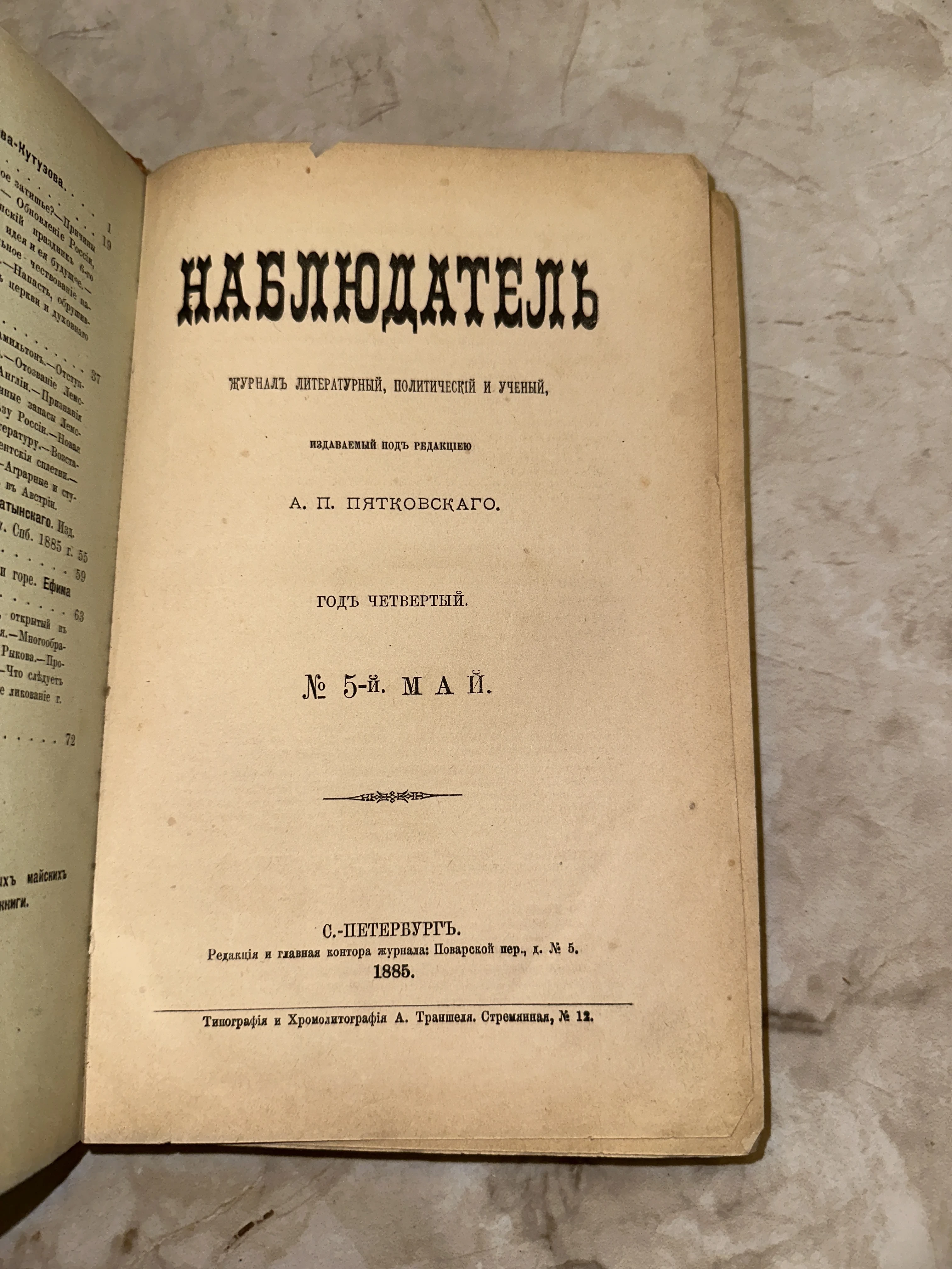 Титульный лист антикварного журнала «Наблюдатель» за май 1885 года, изданного в Санкт-Петербурге под редакцией Пятковского.