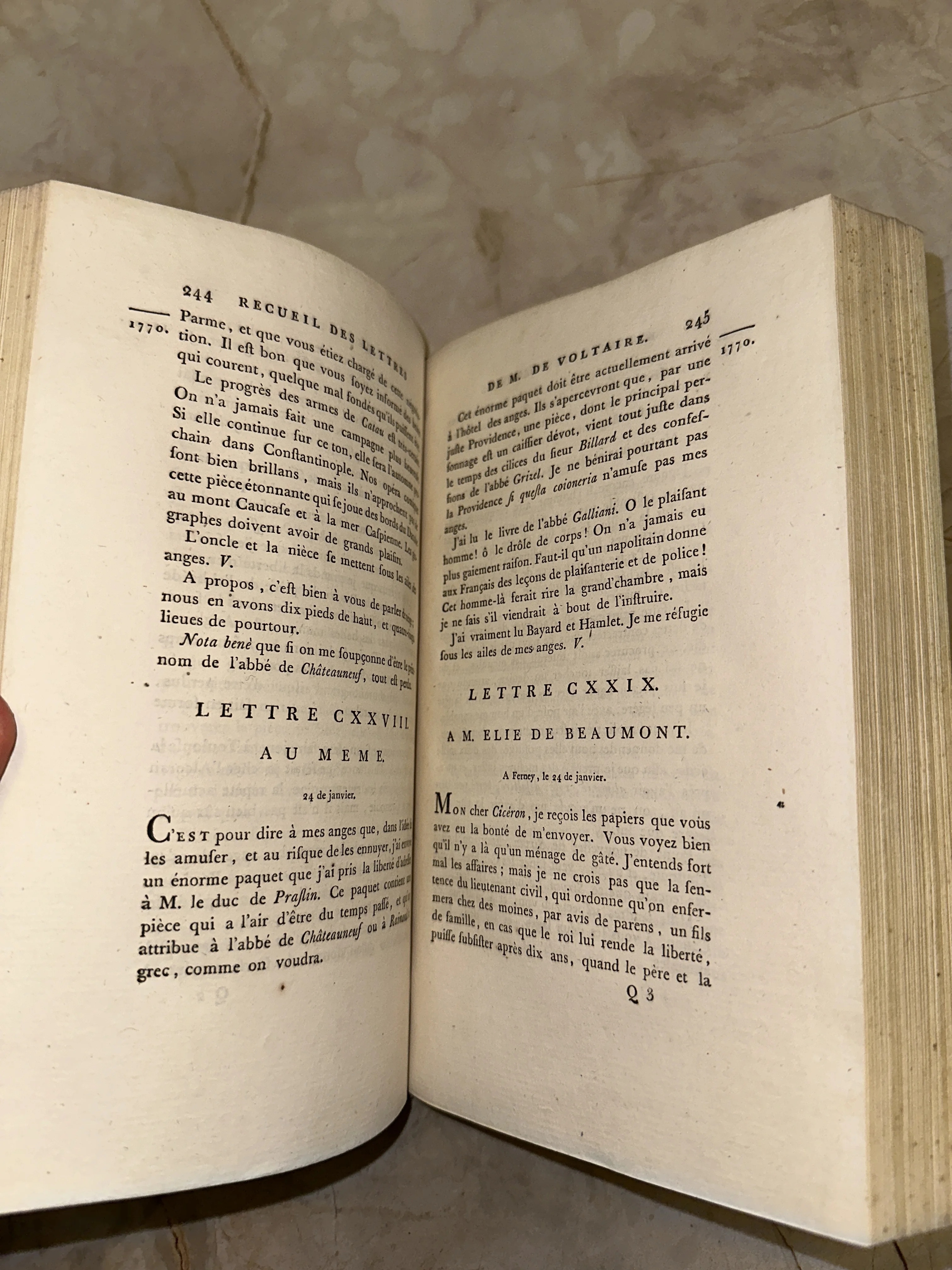 Перед вами уникальный разворот из сборника писем великого французского философа Вольтера, изданного в 1770 году. Благородная патина времени на плотной бумаге верже и изящная типографская печать передают подлинный дух эпохи Просвещения. Этот экземпляр станет ценным приобретением для коллекционеров редких букинистических изданий и любителей европейской истории.