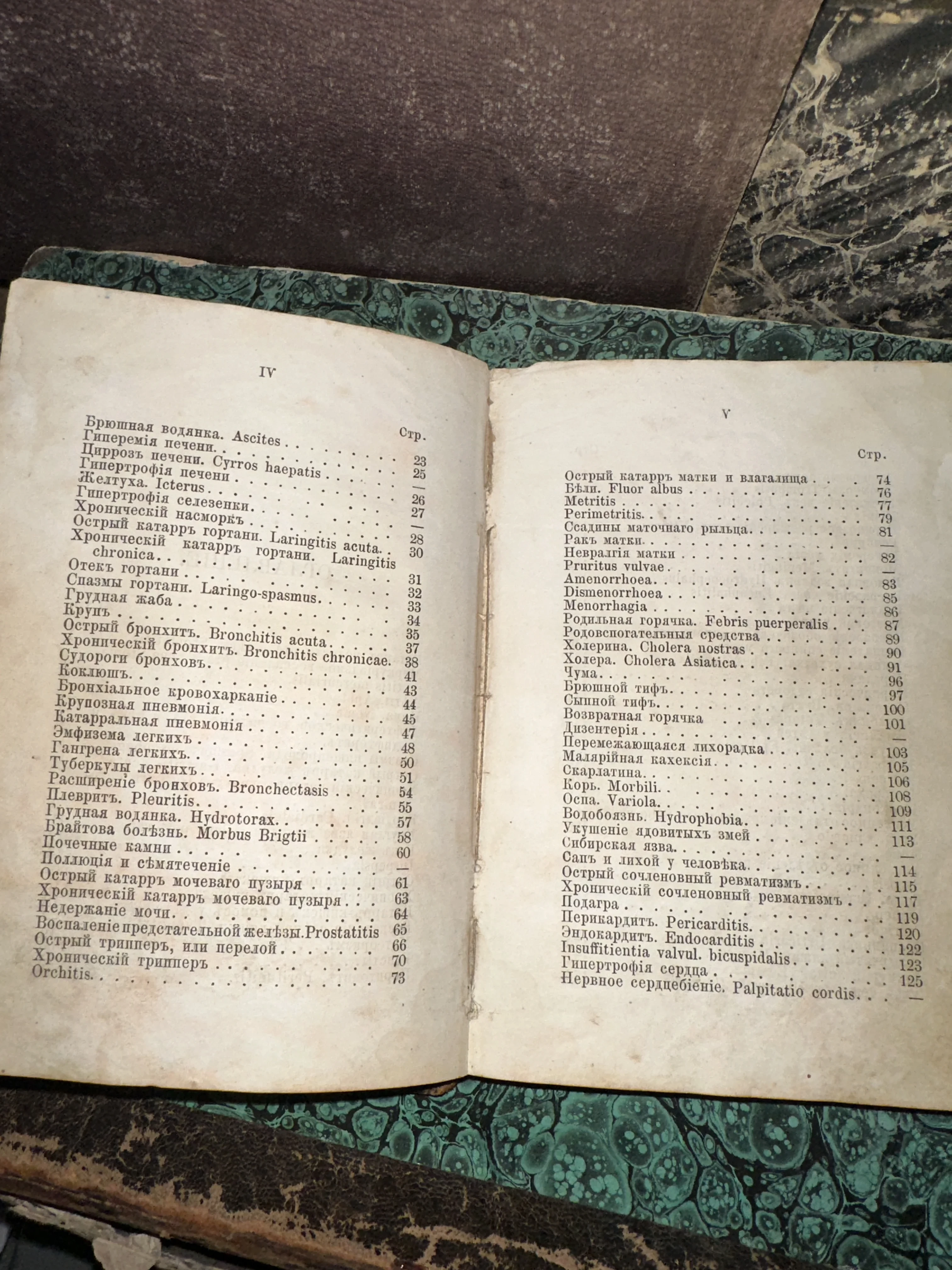 Уникальный фрагмент медицинского издания конца XIX — начала XX века с подробным списком патологий и их латинских названий. Пожелтевшие страницы и характерный дореволюционный шрифт передают атмосферу врачебной практики прошлого, делая книгу ценным артефактом для коллекционеров и историков медицины. Состояние бумаги подчеркивает благородный возраст предмета, дополненного классическим мраморным узором форзаца.
