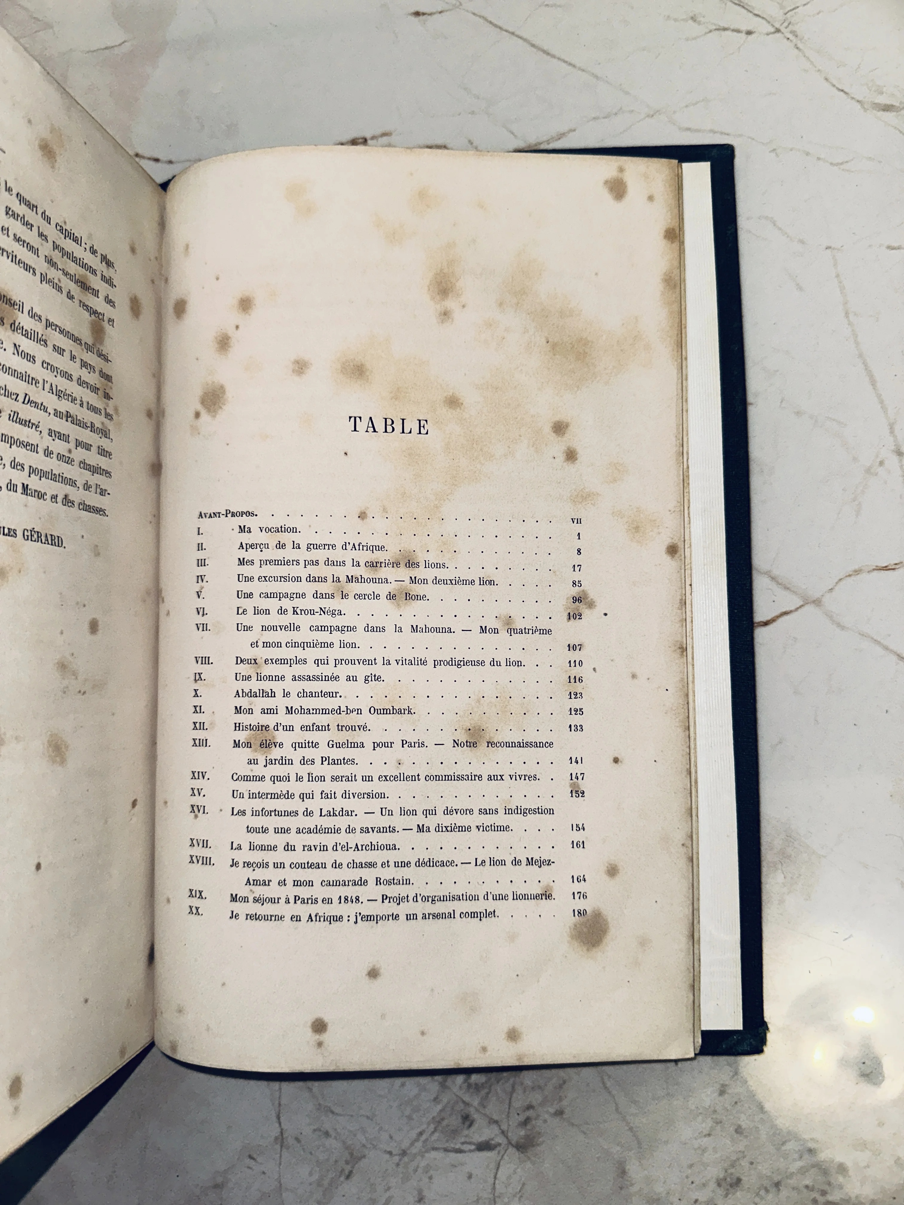Оглавление антикварного французского издания об охоте в Африке