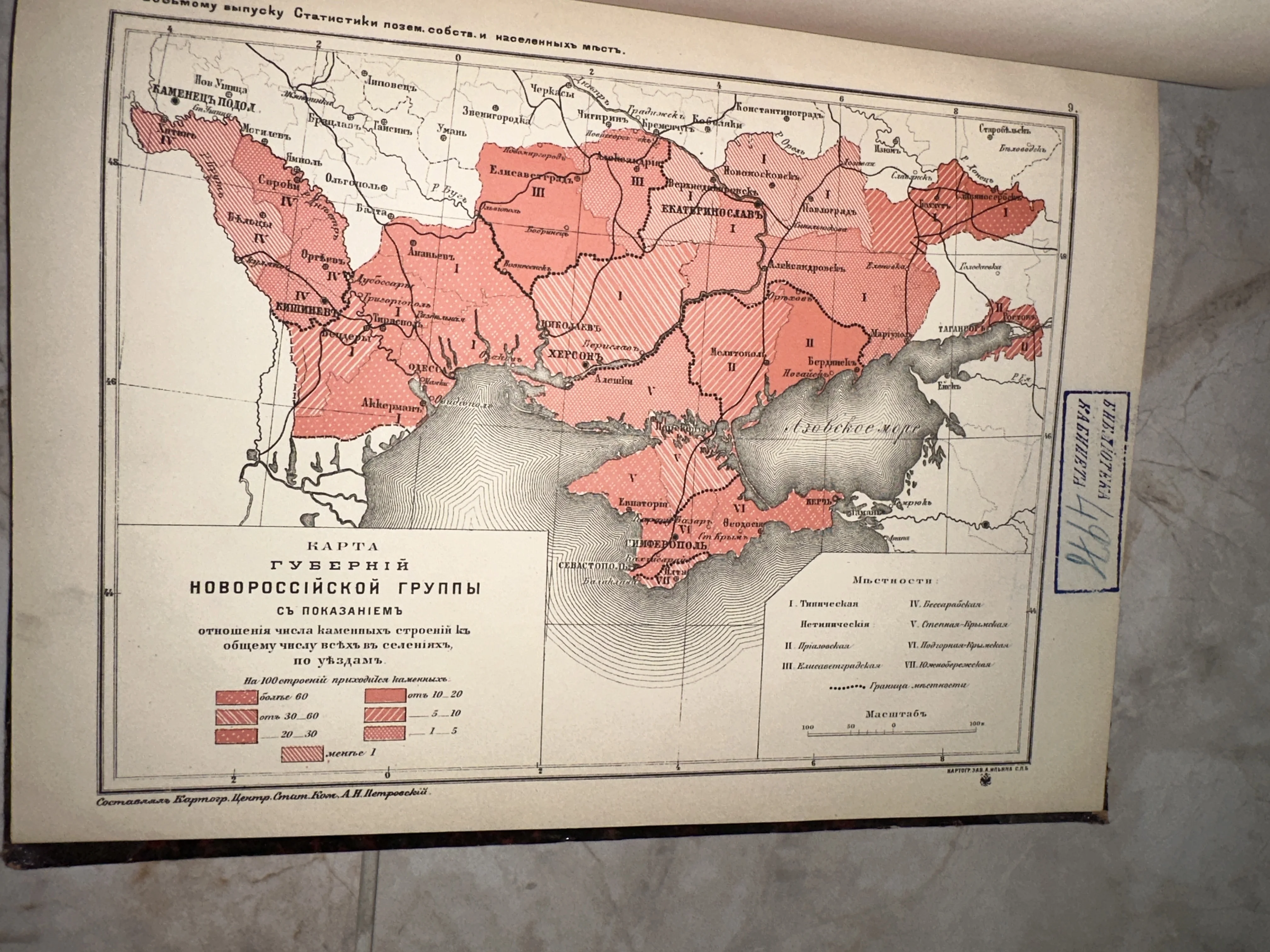 Редкий образец дореволюционной инфографики, изданный знаменитым картографическим заведением А. Ильина в Санкт-Петербурге. Карта наглядно демонстрирует архитектурные особенности юга империи через детальное статистическое зонирование по уездам. Подлинный библиотечный штамп и благородная патина времени придают этому экземпляру особую коллекционную и историческую ценность.