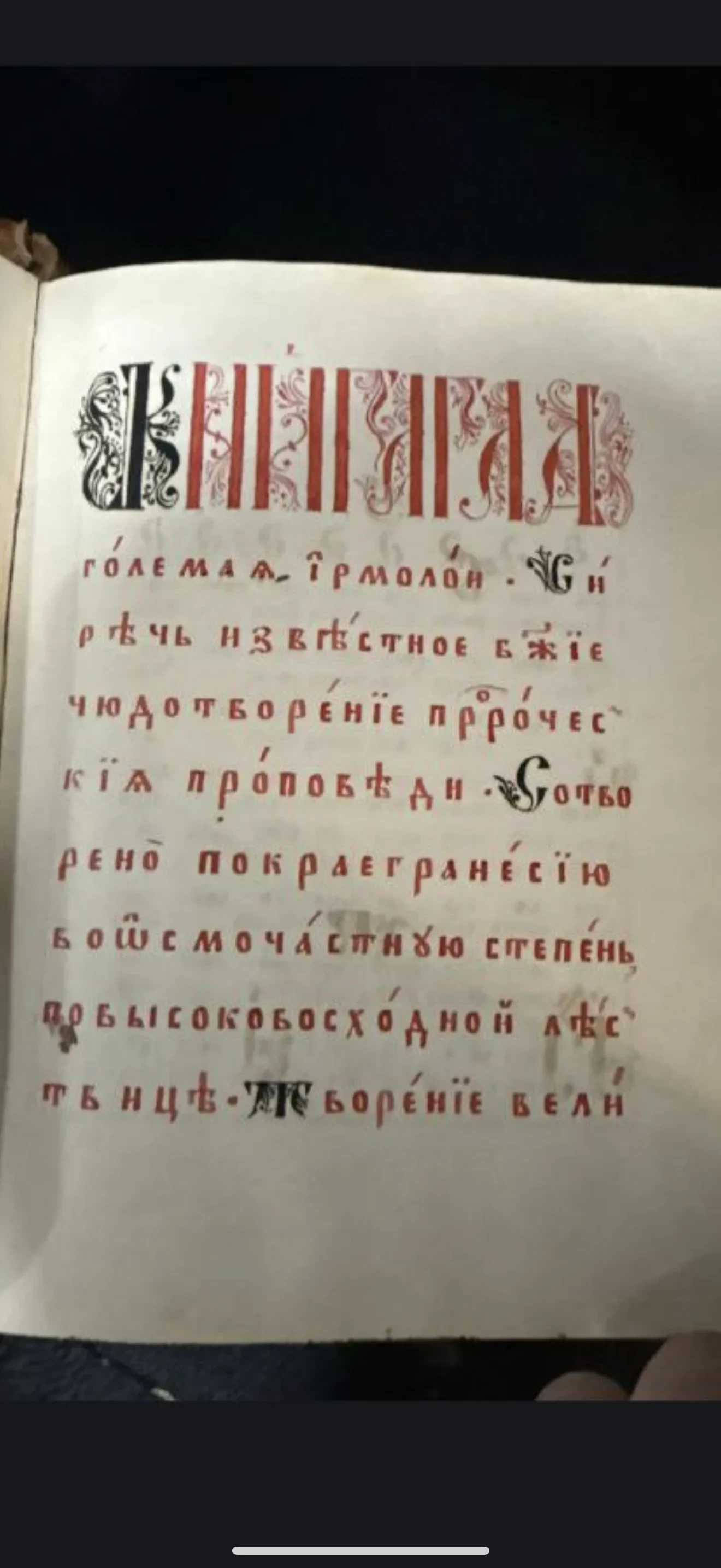 Разворот старинной книги с текстом на церковнославянском языке, выполненным черными и красными чернилами с декоративным заголовком.