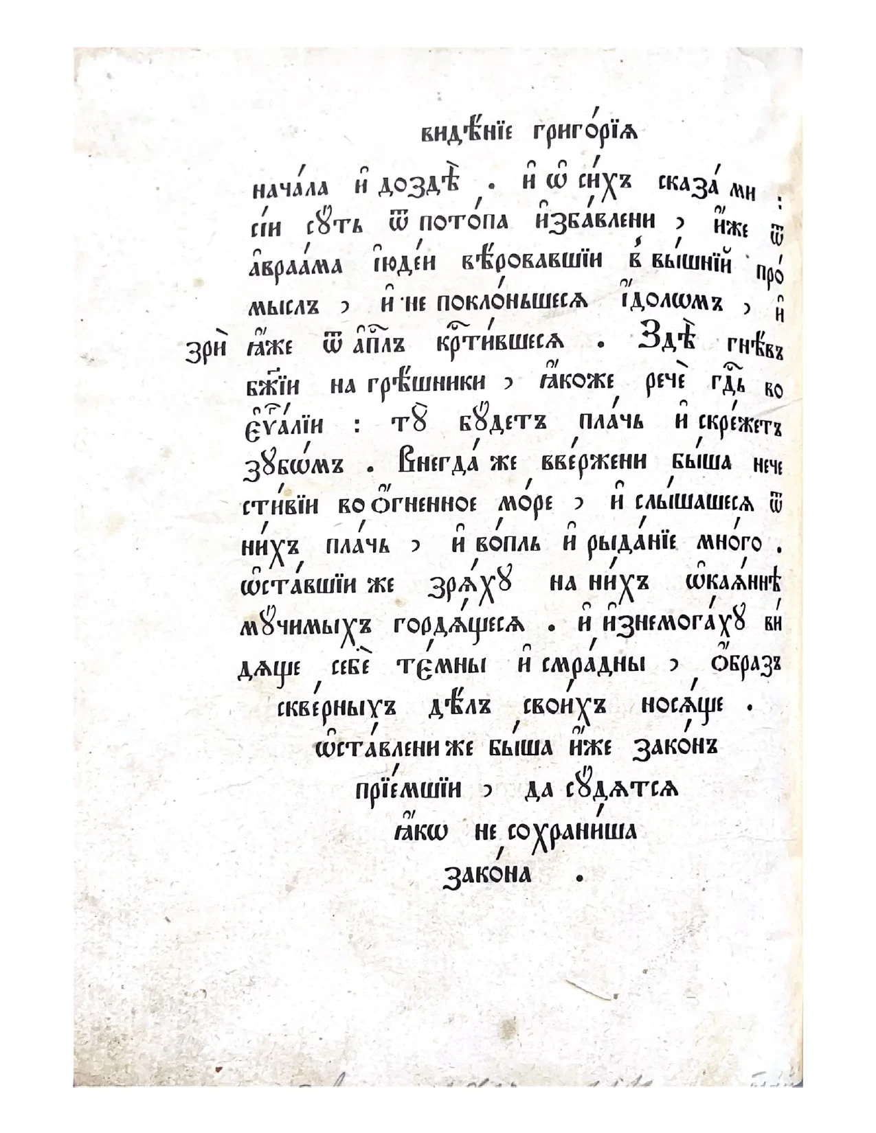 Уникальный образец религиозной письменности, запечатлевший фрагмент известного эсхатологического сюжета «Видение Григория». Текст выполнен строгим полууставом на плотной бумаге с характерными следами времени, создающими неповторимую атмосферу древности. Лист сохранил четкость начертания букв и является ценным артефактом для коллекционеров кириллических памятников.