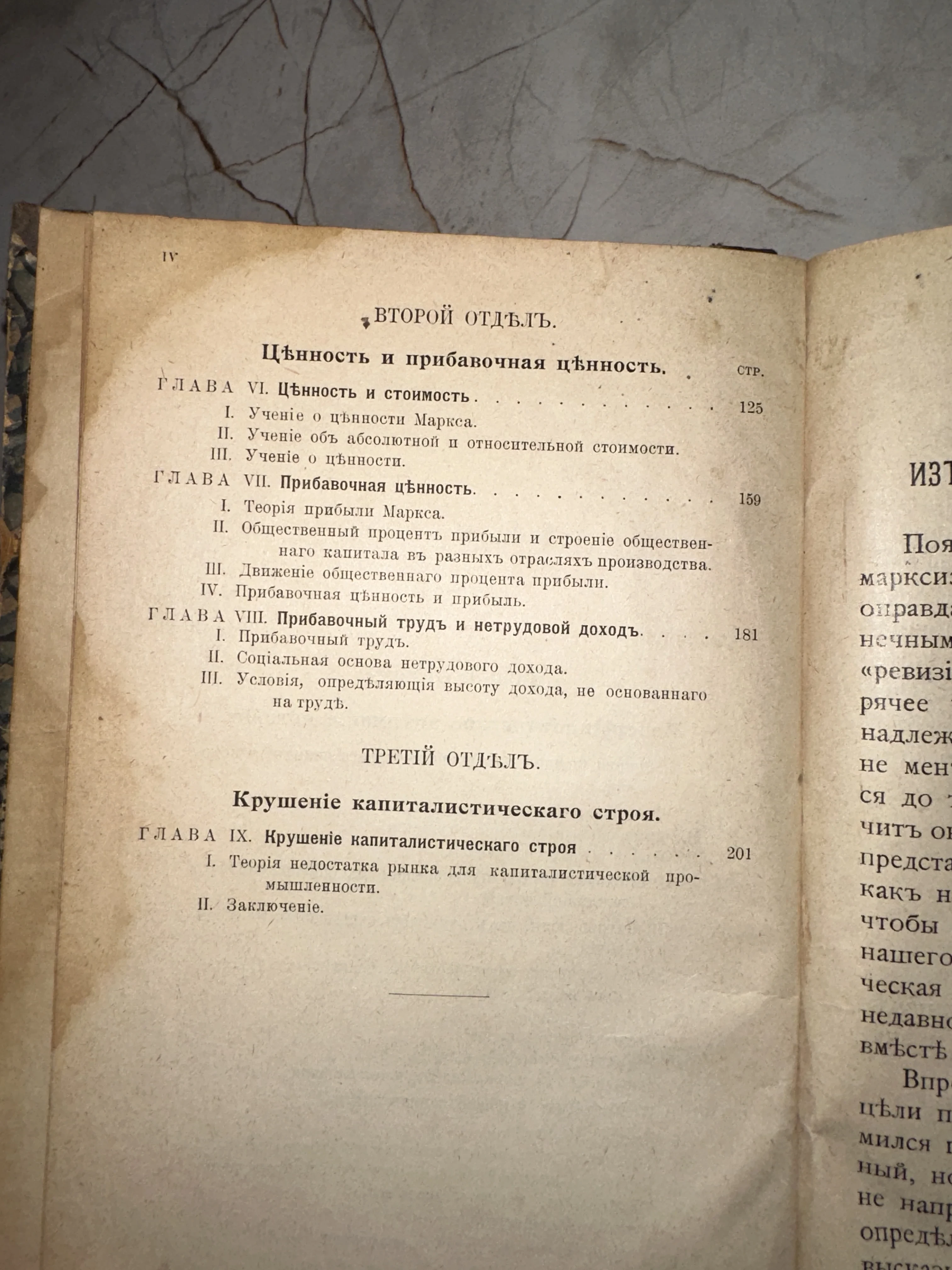 Фотография страницы оглавления старой книги с текстом в дореволюционной орфографии, упоминающим Маркса и теорию прибавочной ценности.