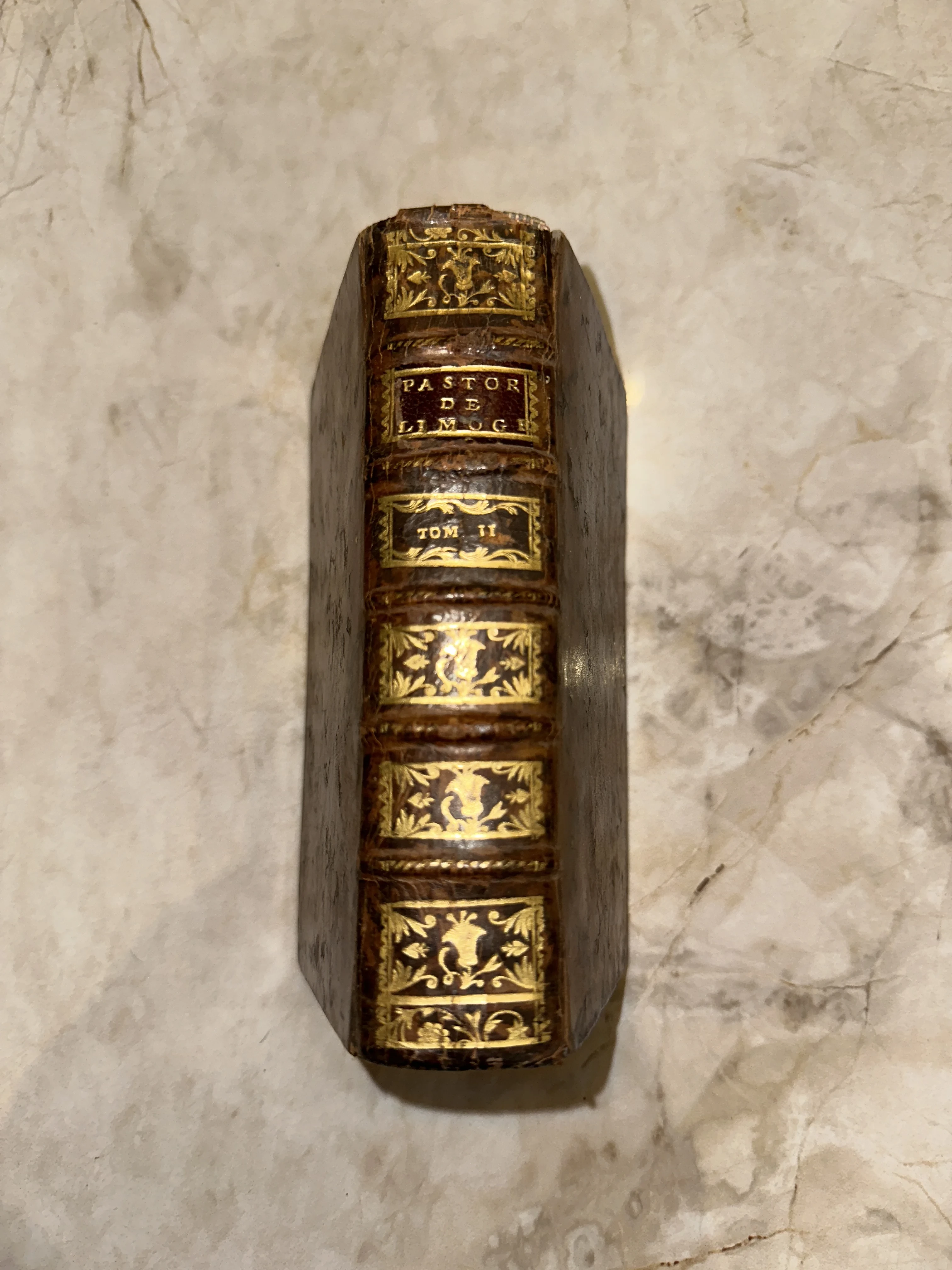 Корешок антикварной книги в коричневом кожаном переплете с золотым тиснением и надписью Pastor de Limoge Tom II.