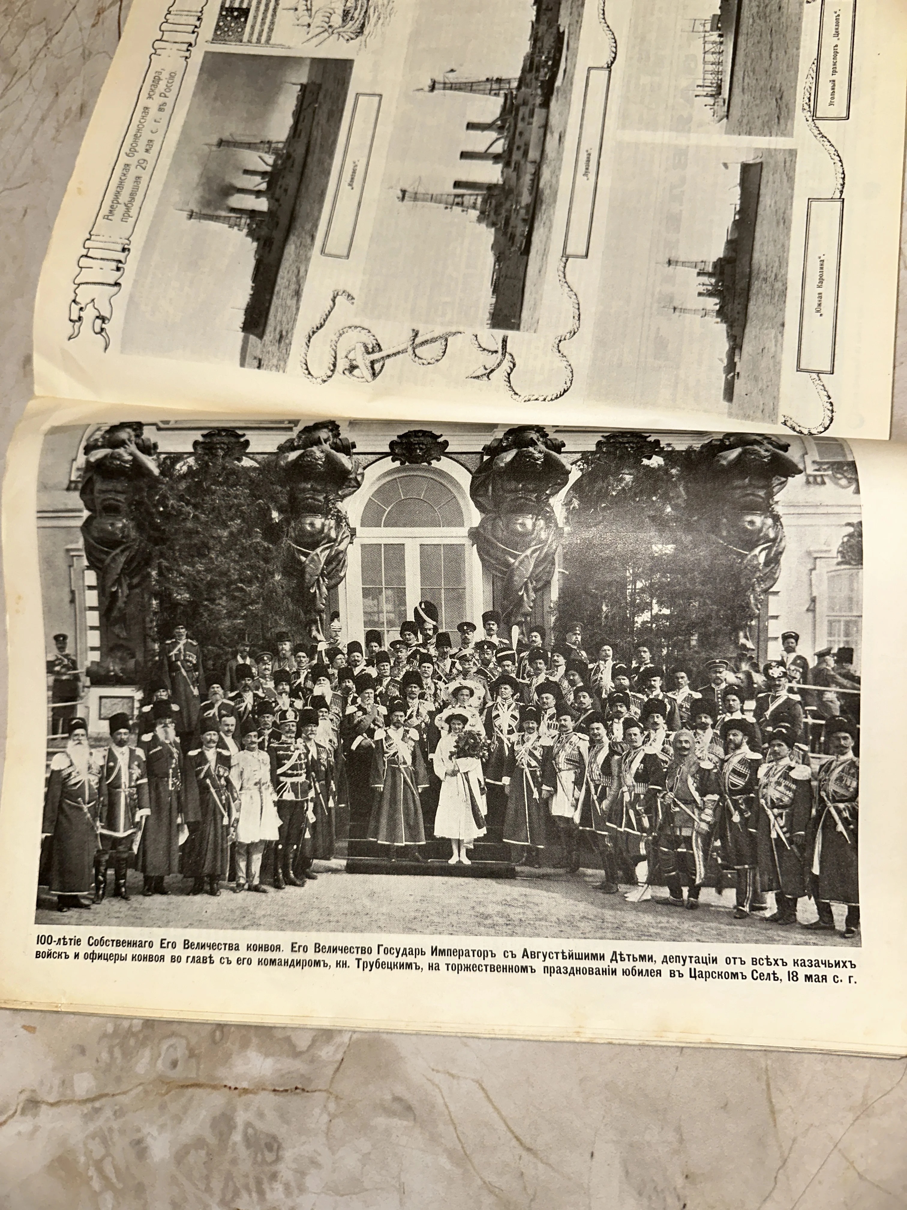 Этот уникальный разворот из дореволюционного издания представляет собой ценное документальное свидетельство эпохи правления Николая II. На центральном снимке запечатлено торжественное празднование юбилея императорского конвоя в Царском Селе, где детально проработаны мундиры казачьих войск и архитектурное величие дворцового окружения. Бумажный носитель сохранил четкость типографской печати начала XX века, передавая дух имперской России и значимость исторических событий того времени.
