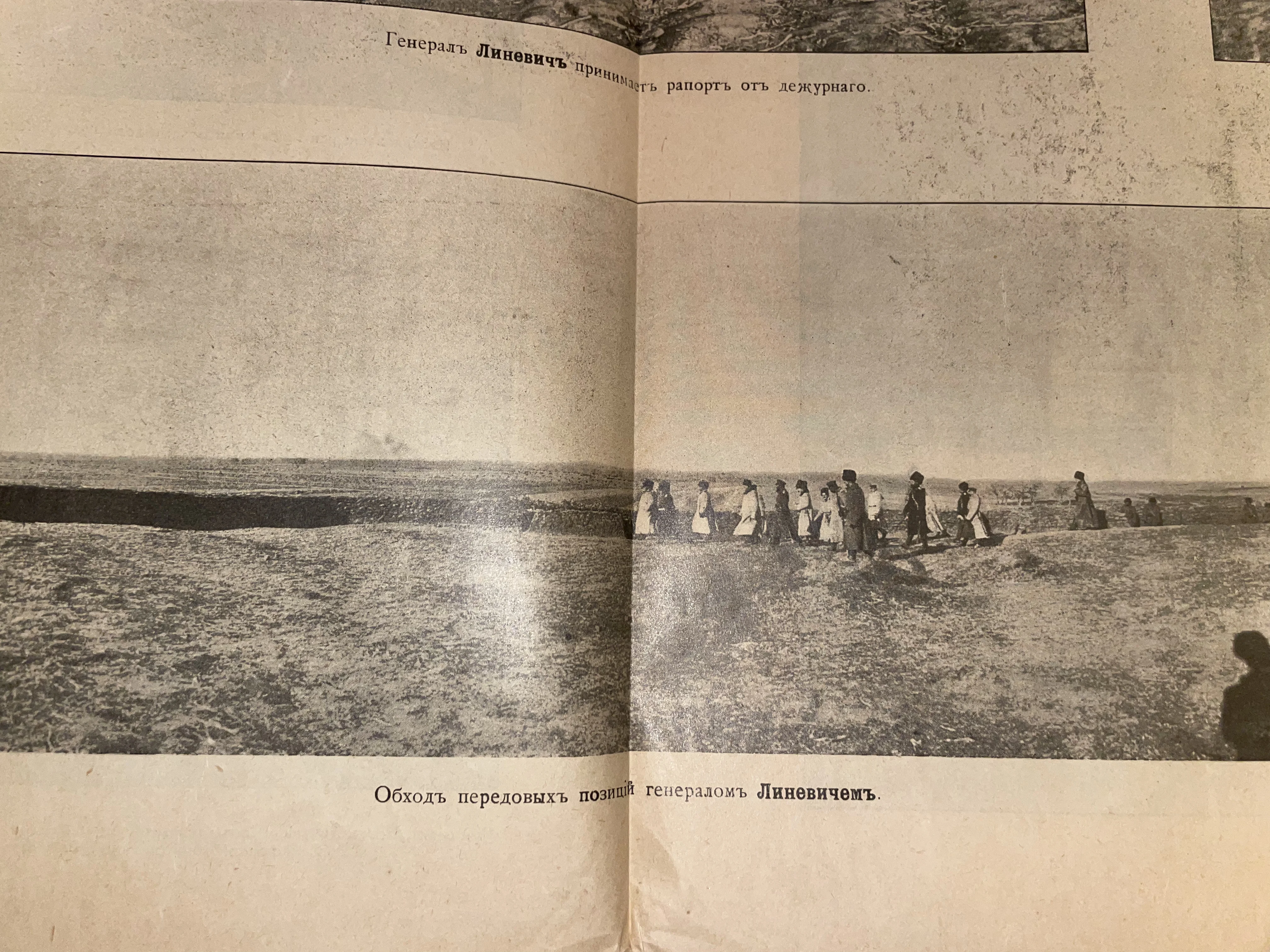 Уникальный документальный кадр эпохи Русско-японской войны, запечатлевший инспекцию войск генералом Н. П. Линевичем. Страница старинного журнала сохранила четкость типографской печати начала XX века и благородную патину времени. Это подлинное свидетельство военной истории, передающее суровую атмосферу фронтовых будней Российской империи.