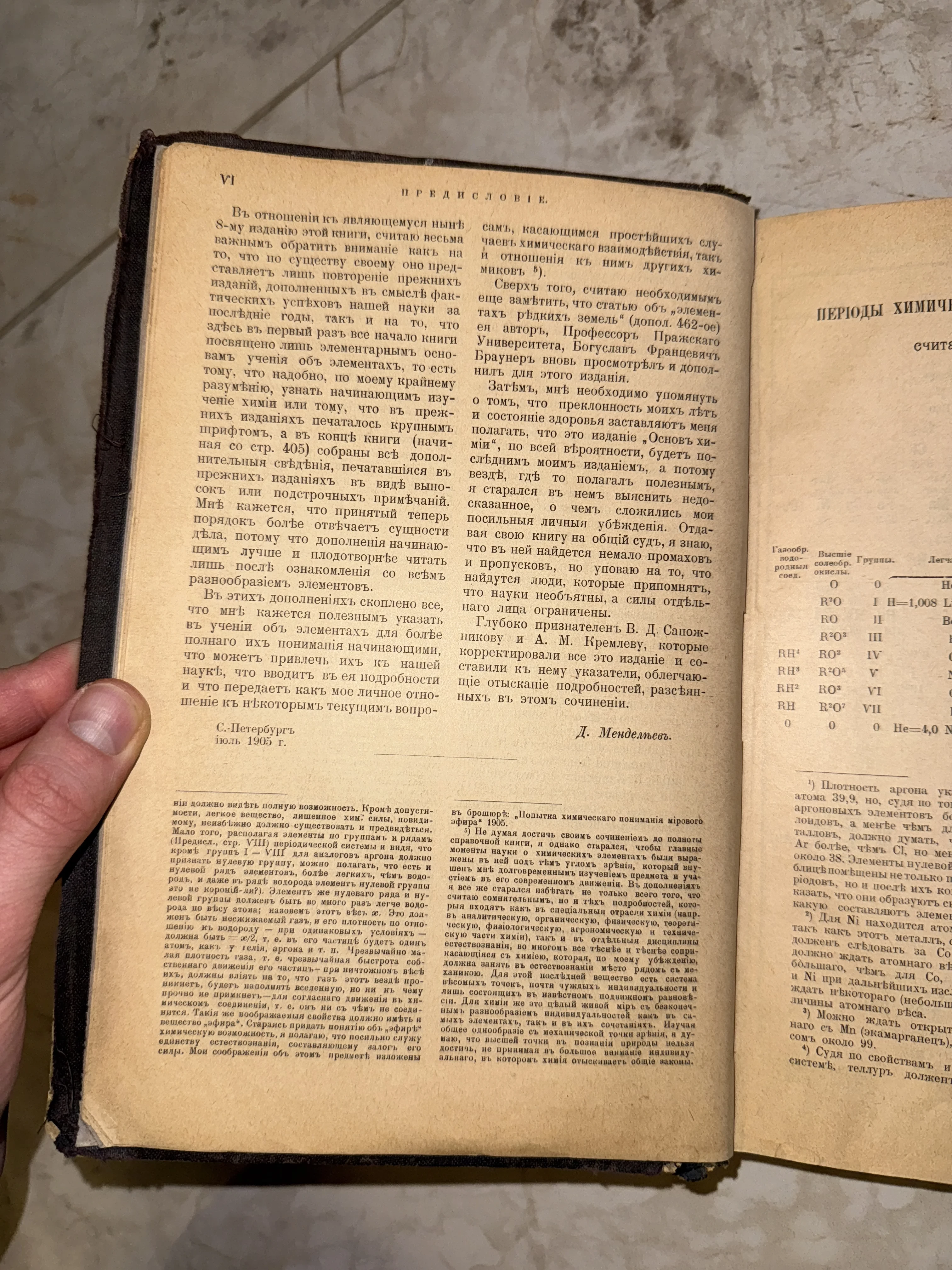 Разворот антикварной книги с текстом предисловия к 8-му изданию, подписанным Д. Менделеевым в Санкт-Петербурге.