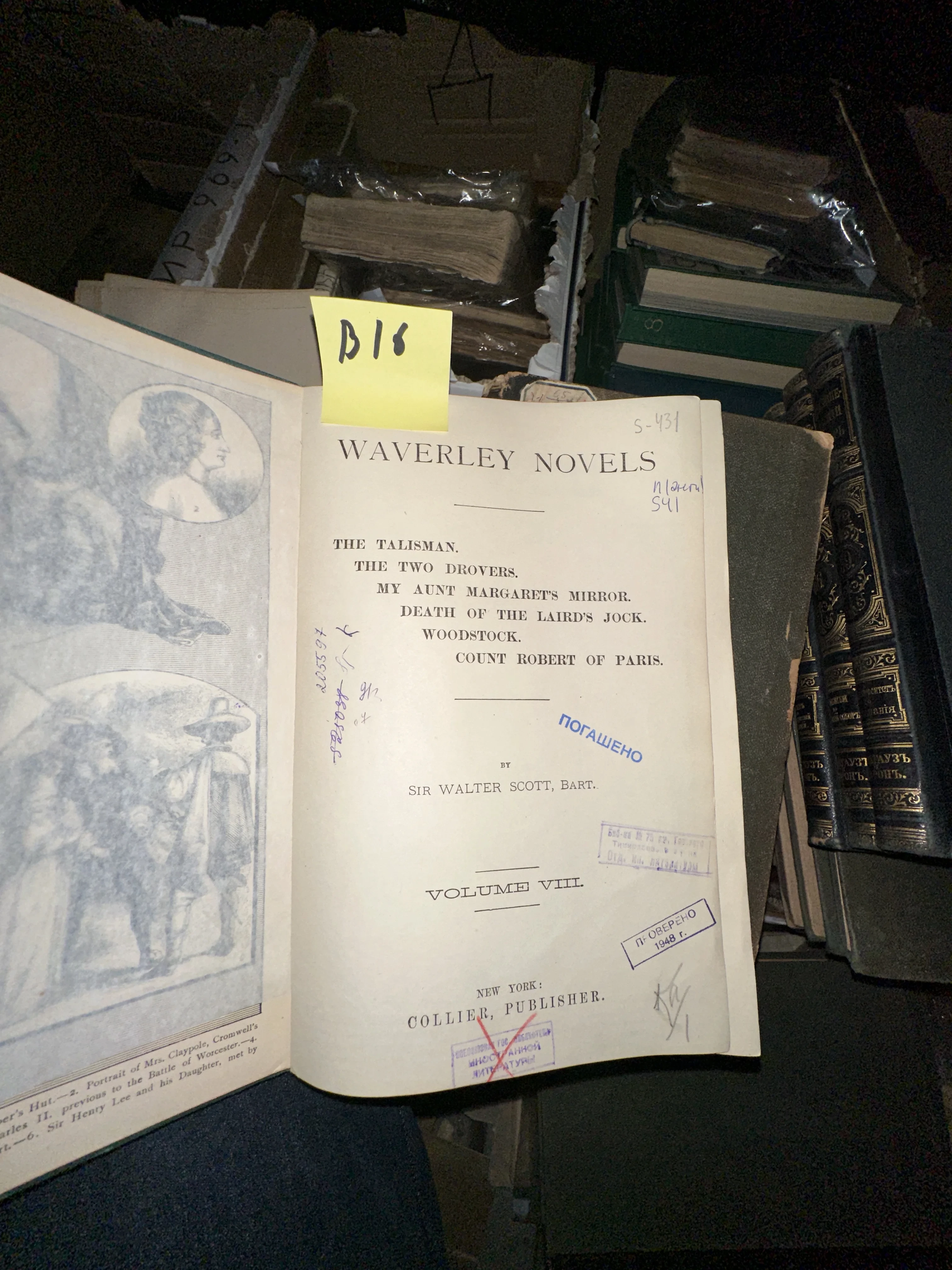 Разворот антикварной книги Вальтера Скотта Waverley Novels с титульным листом и гравюрой, издательство Collier, Нью-Йорк.