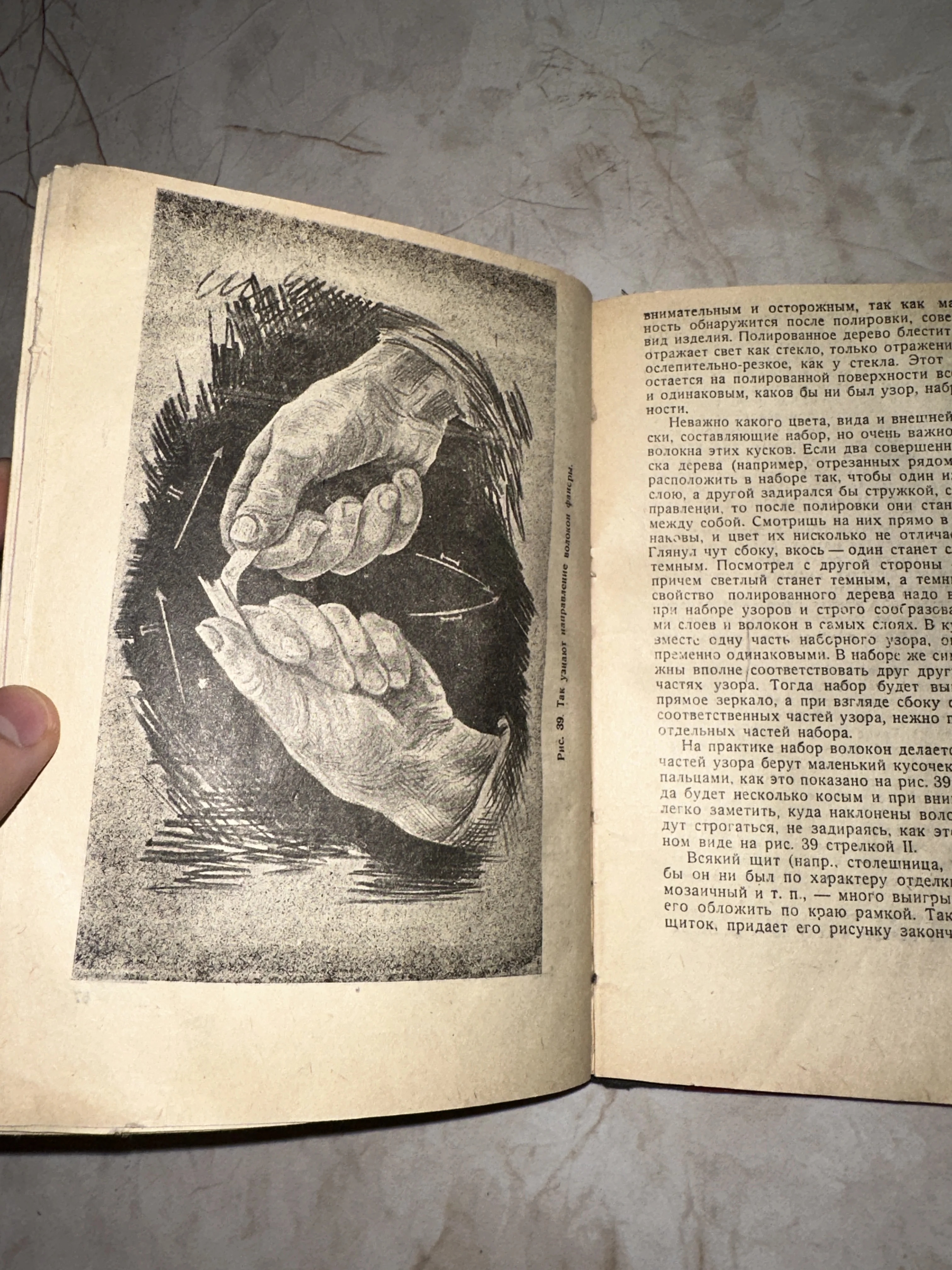 Разворот старой книги с черно-белой иллюстрацией, на которой руки мастера проверяют направление волокон древесины.