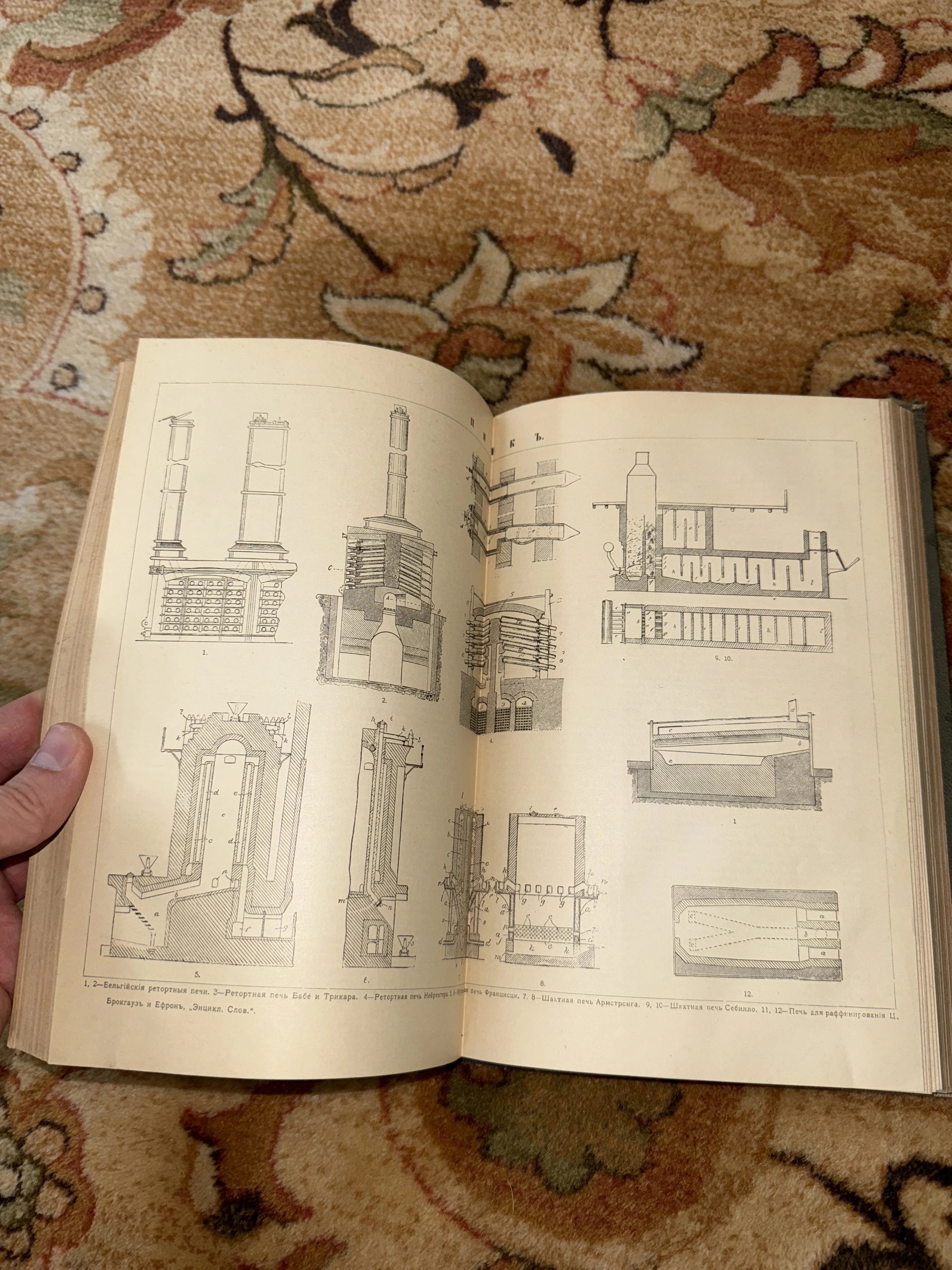 Уникальный разворот из легендарного издания Брокгауза и Ефрона, демонстрирующий тончайшую графику технических иллюстраций индустриальной эпохи. Пожелтевшие страницы сохранили четкость линий и подробные подписи к чертежам металлургических установок, передавая атмосферу научного прогресса прошлого столетия. Коллекционная сохранность бумаги делает этот экземпляр ценным артефактом для любителей истории техники и книжного искусства.