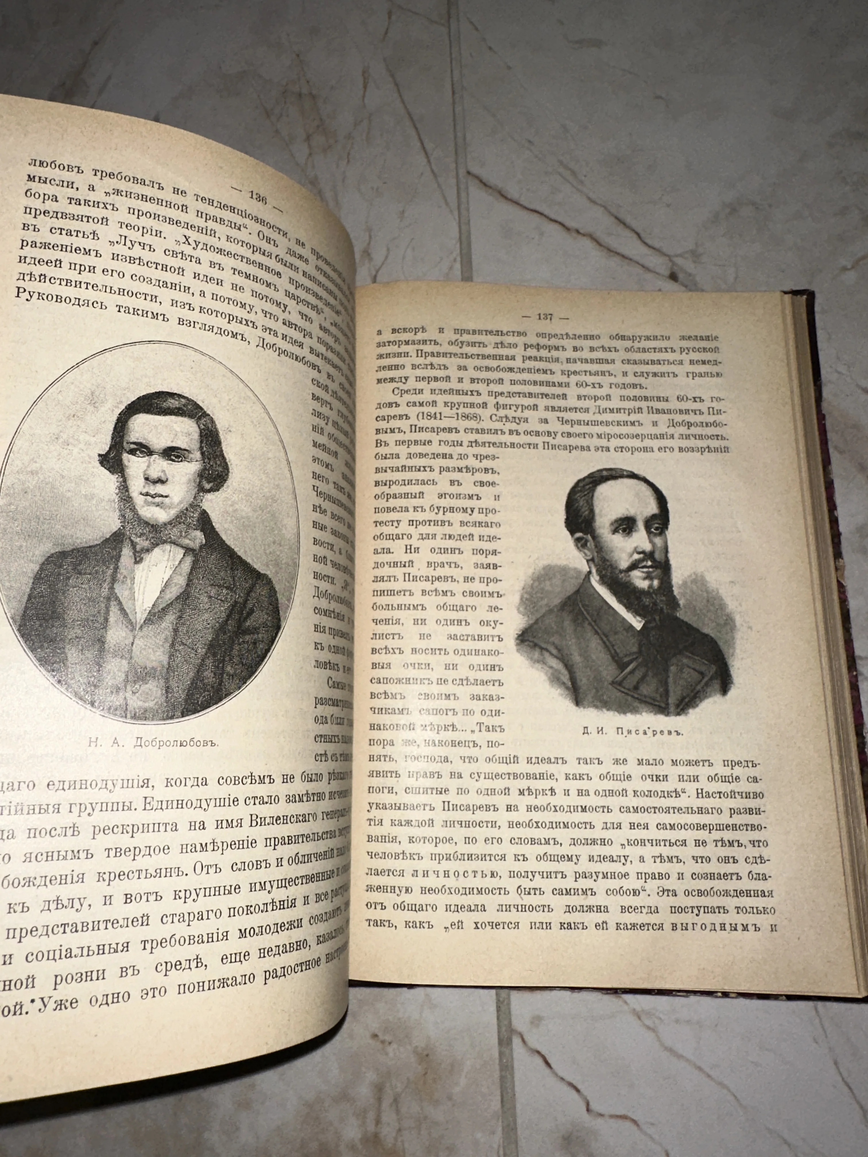 Разворот старинной книги с портретными гравюрами русских литературных критиков Добролюбова и Писарева и дореволюционным шрифтом.