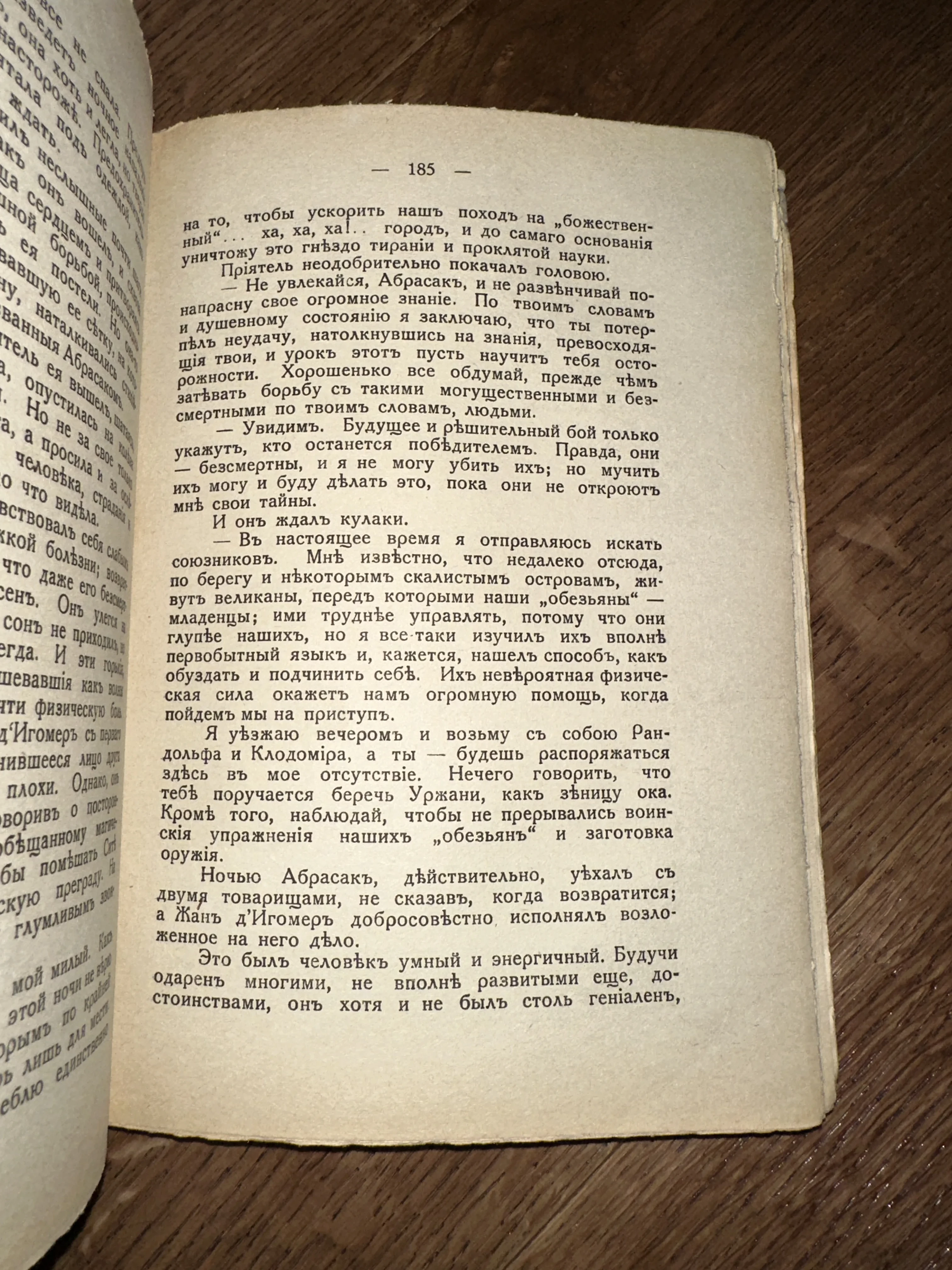 Перед вами страница из старинного приключенческого романа, сохранившая неповторимый колорит дореволюционной типографики с характерными «ятями» и «ерами». Пожелтевшая от времени бумага и четкий черный шрифт создают особую атмосферу подлинности, приглашая прикоснуться к истории книжного дела. Этот экземпляр станет прекрасным приобретением для ценителей старой школы книгоиздания и собирателей редких фолиантов.