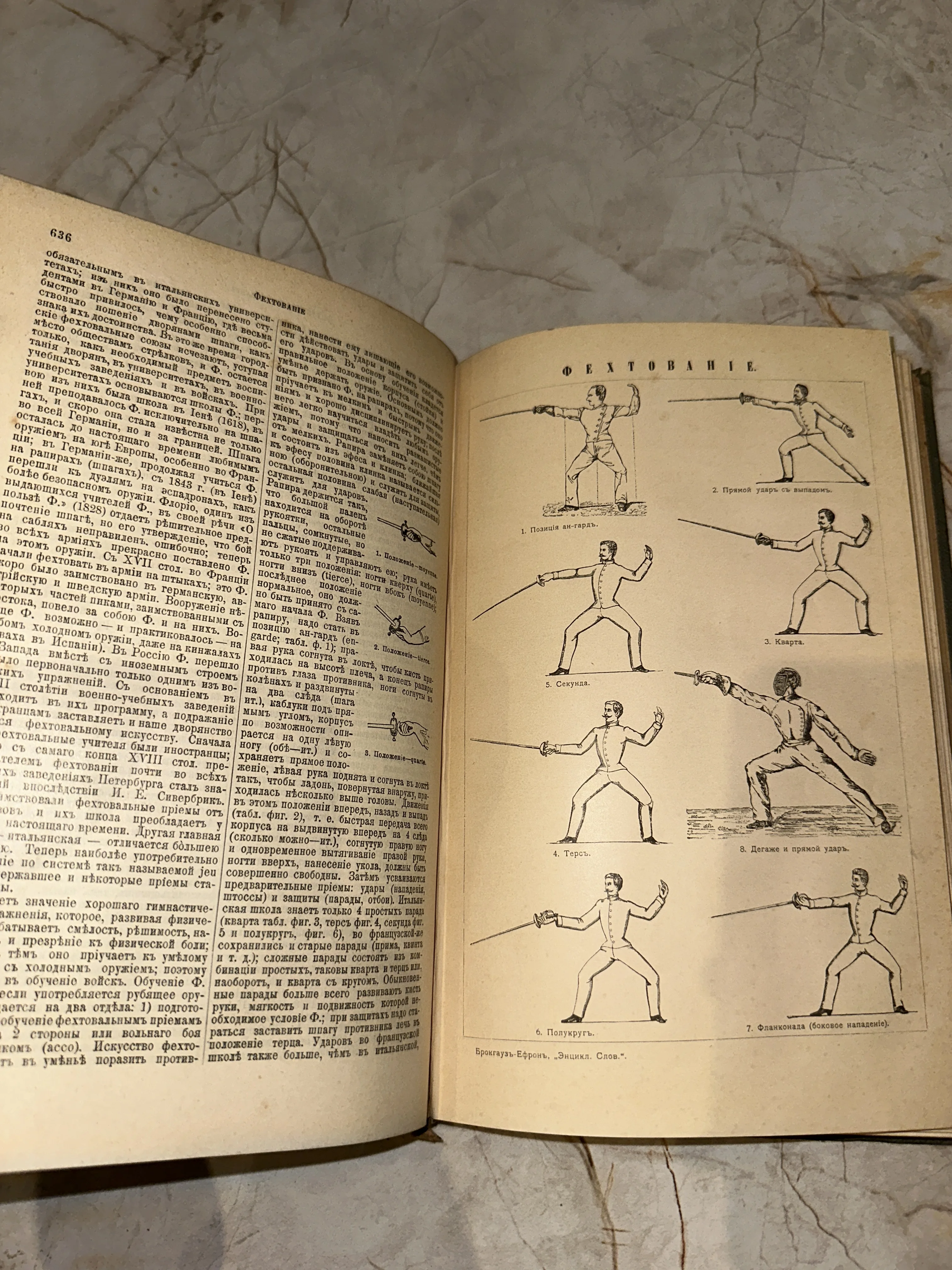 Перед вами подлинный фрагмент истории из знаменитого энциклопедического словаря Брокгауза и Ефрона. На пожелтевших от времени страницах детально изложены основы классического фехтования, дополненные изящными гравированными иллюстрациями различных позиций и выпадов. Состояние бумаги и четкость дореволюционного шрифта делают этот экземпляр ценным приобретением для ценителей редких изданий и военной истории.