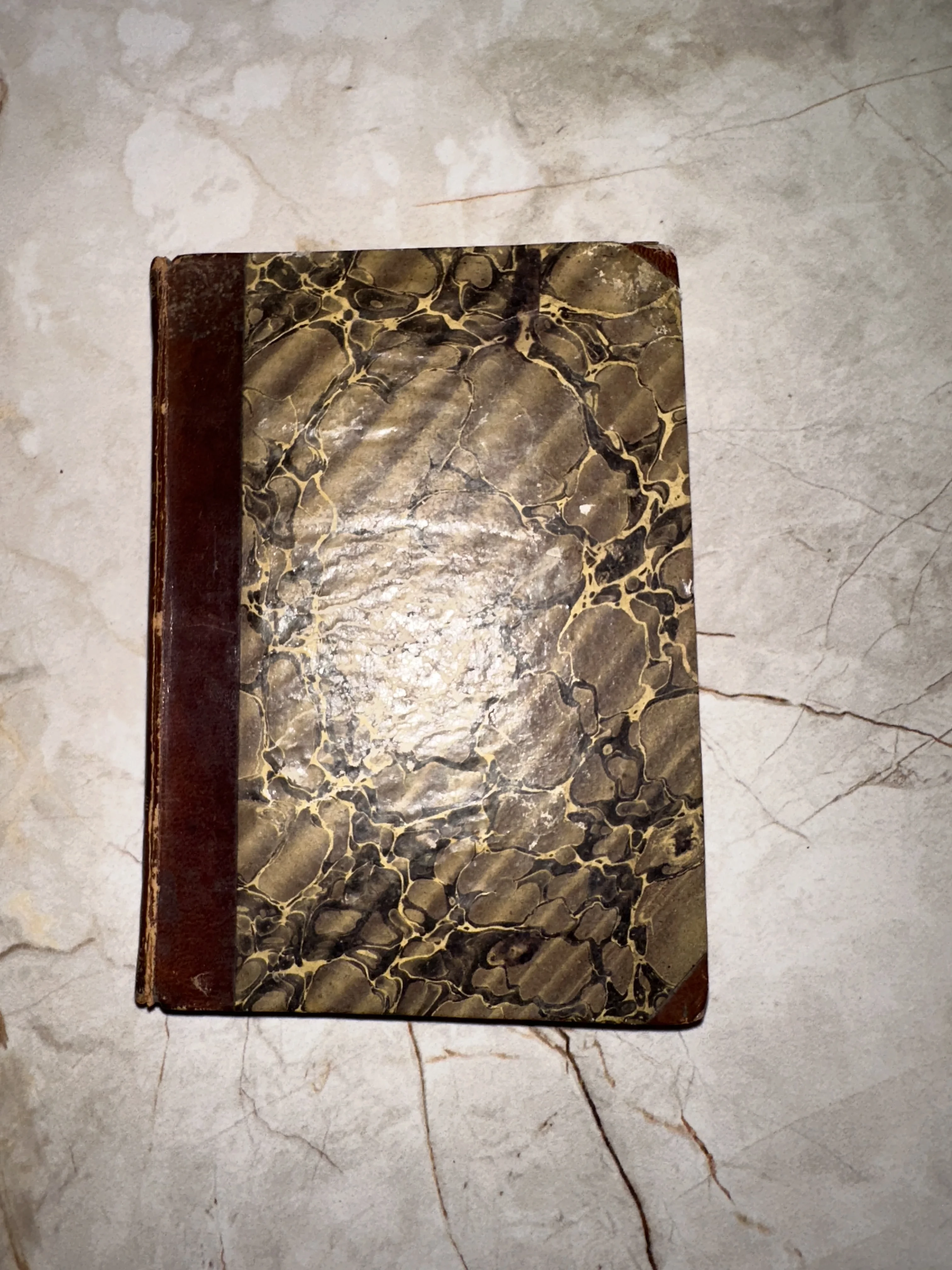 Старинная антикварная книга с темным корешком и обложкой, имитирующей рисунок мрамора, на светлой поверхности.