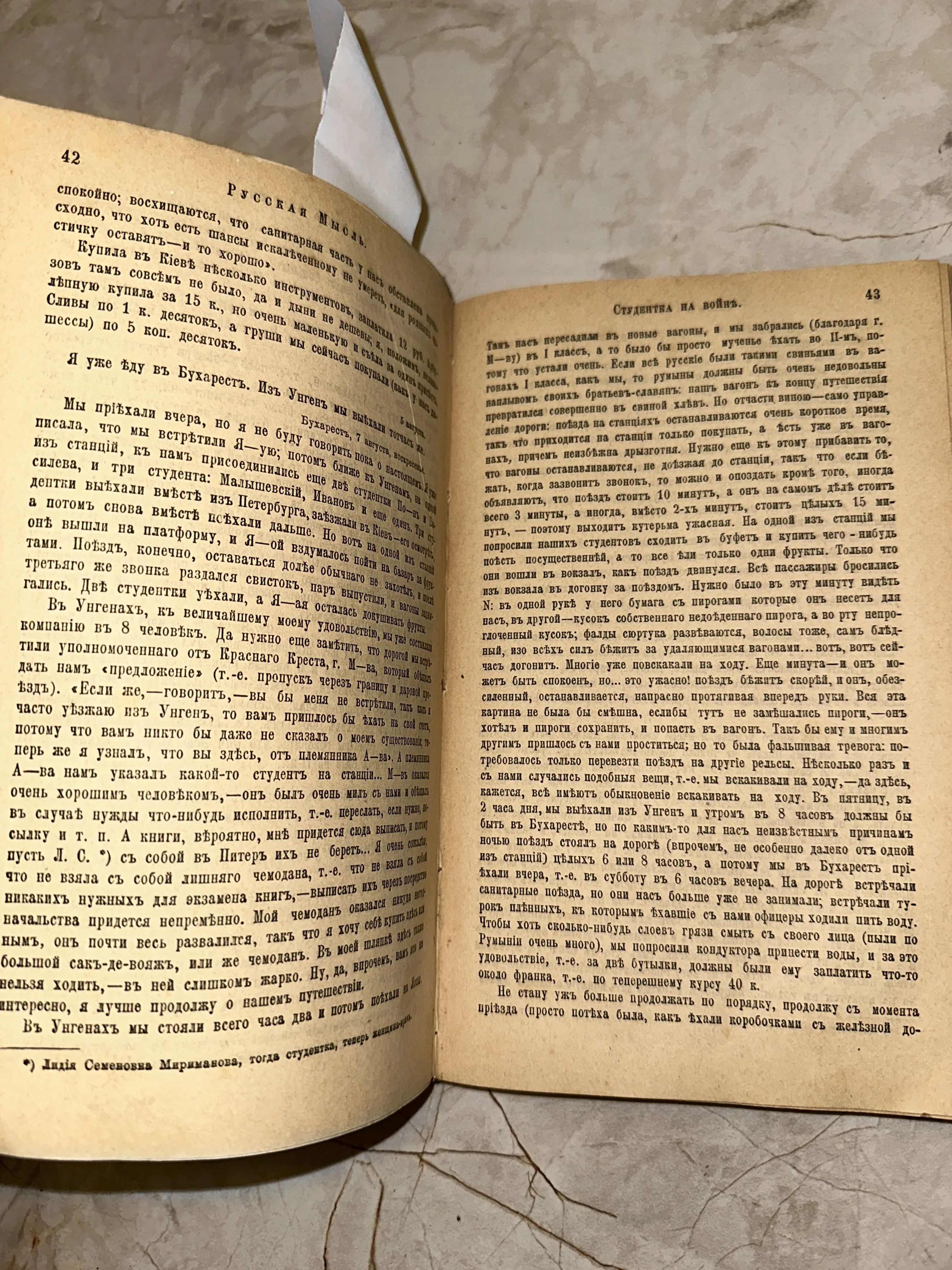 Перед вами подлинный фрагмент истории — страницы знаменитого журнала «Русская Мысль» с очерком «Студентка на войне». Дореволюционная орфография и благородная патина времени на бумаге создают неповторимое ощущение сопричастности к событиям начала прошлого столетия. Идеальный экземпляр для коллекционеров редкой периодики и исследователей быта времен Великой войны.