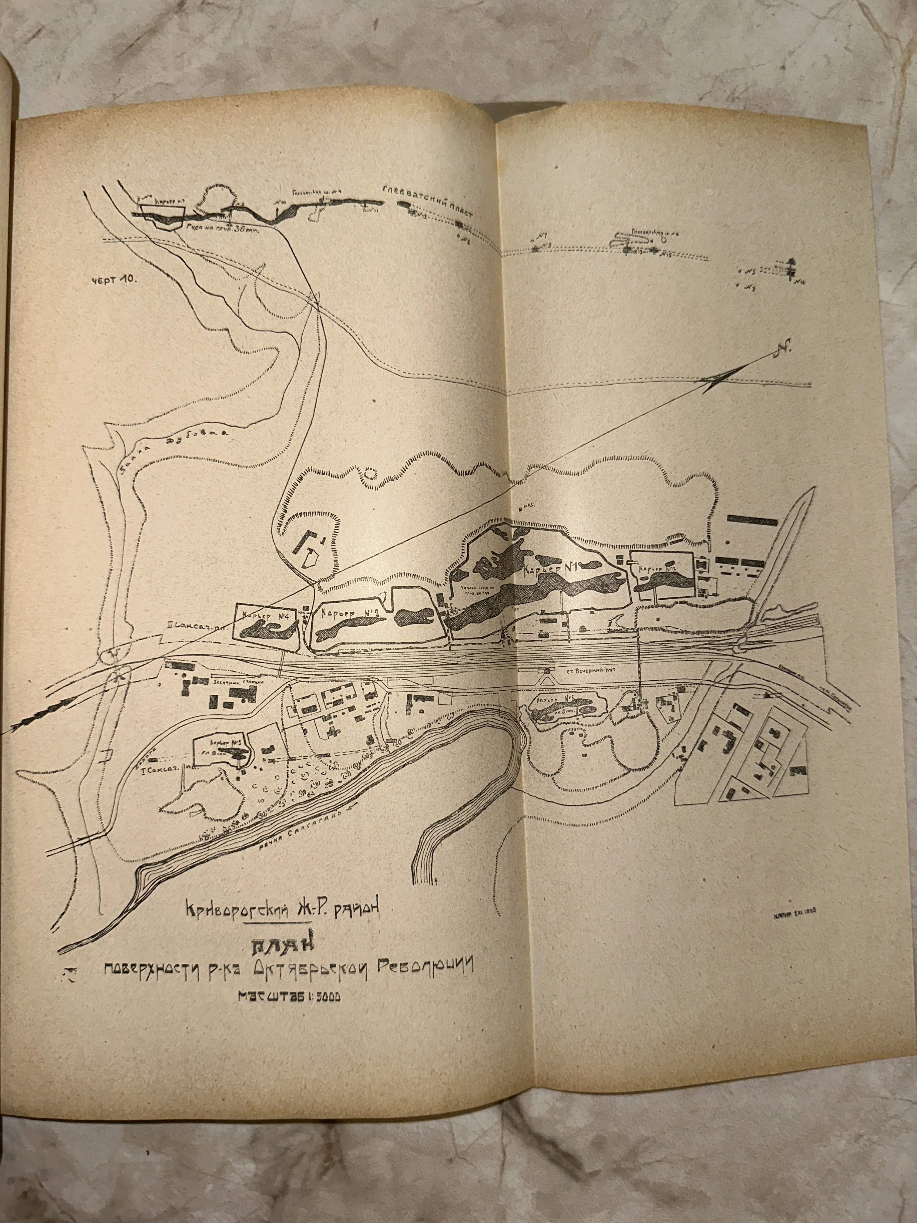 Уникальный исторический документ, представляющий детальную схему индустриального ландшафта Криворожья конца 1920-х годов. На плане четко обозначены карьеры, русла рек и технические постройки, что делает его ценным источником для изучения истории горного дела. Прекрасный образец промышленной картографии с характерной графикой эпохи первых пятилеток.