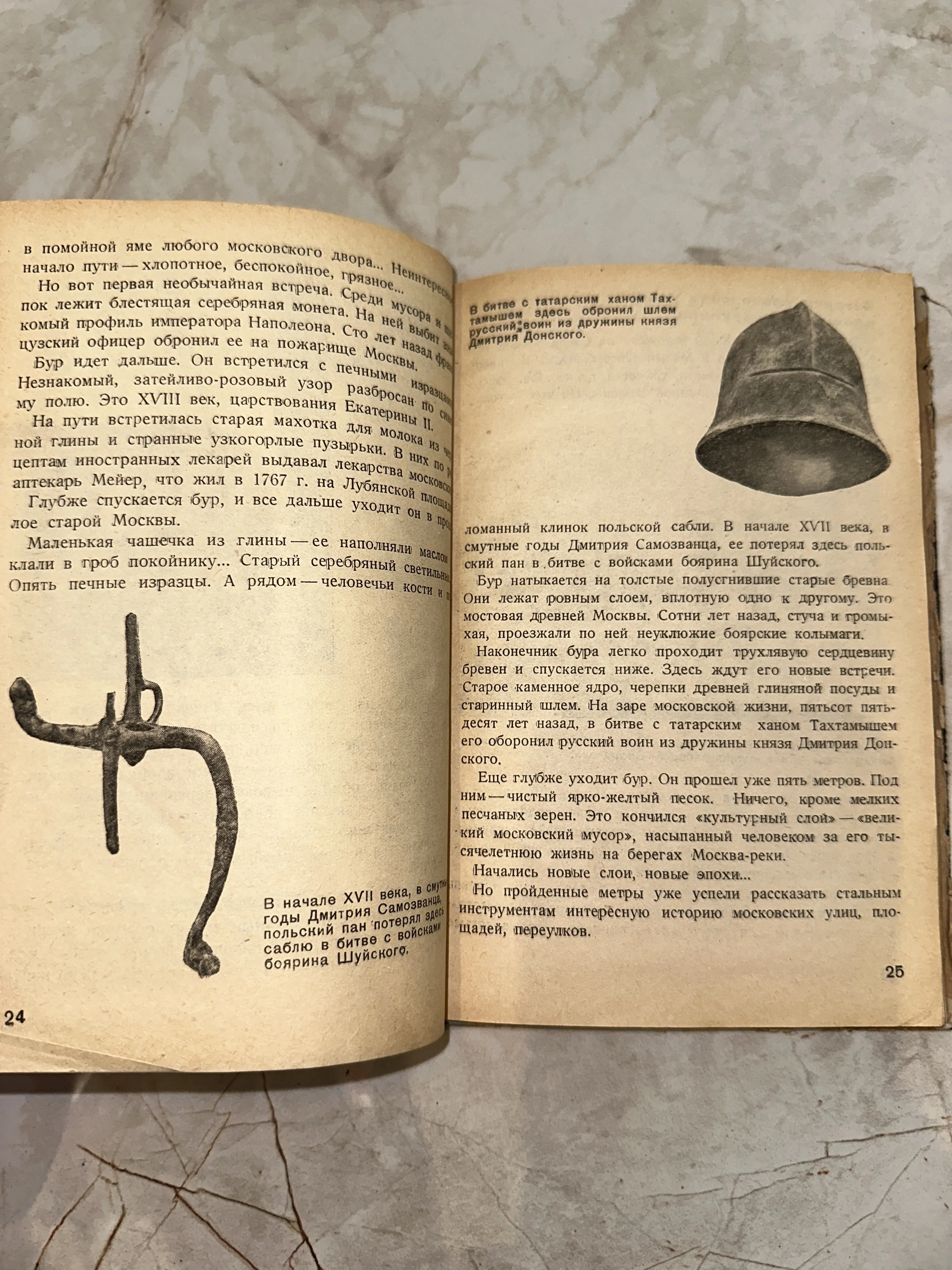 Этот книжный разворот приглашает в увлекательное путешествие по культурным слоям старой Москвы, оживляя историю через описания находок — от екатерининских изразцов до шлема времен Дмитрия Донского. Благородная патина времени на пожелтевших страницах и детальная графика иллюстраций создают атмосферу подлинного археологического поиска. Издание станет прекрасным дополнением коллекции для тех, кто увлечен тайнами московских улиц и отечественной историей.