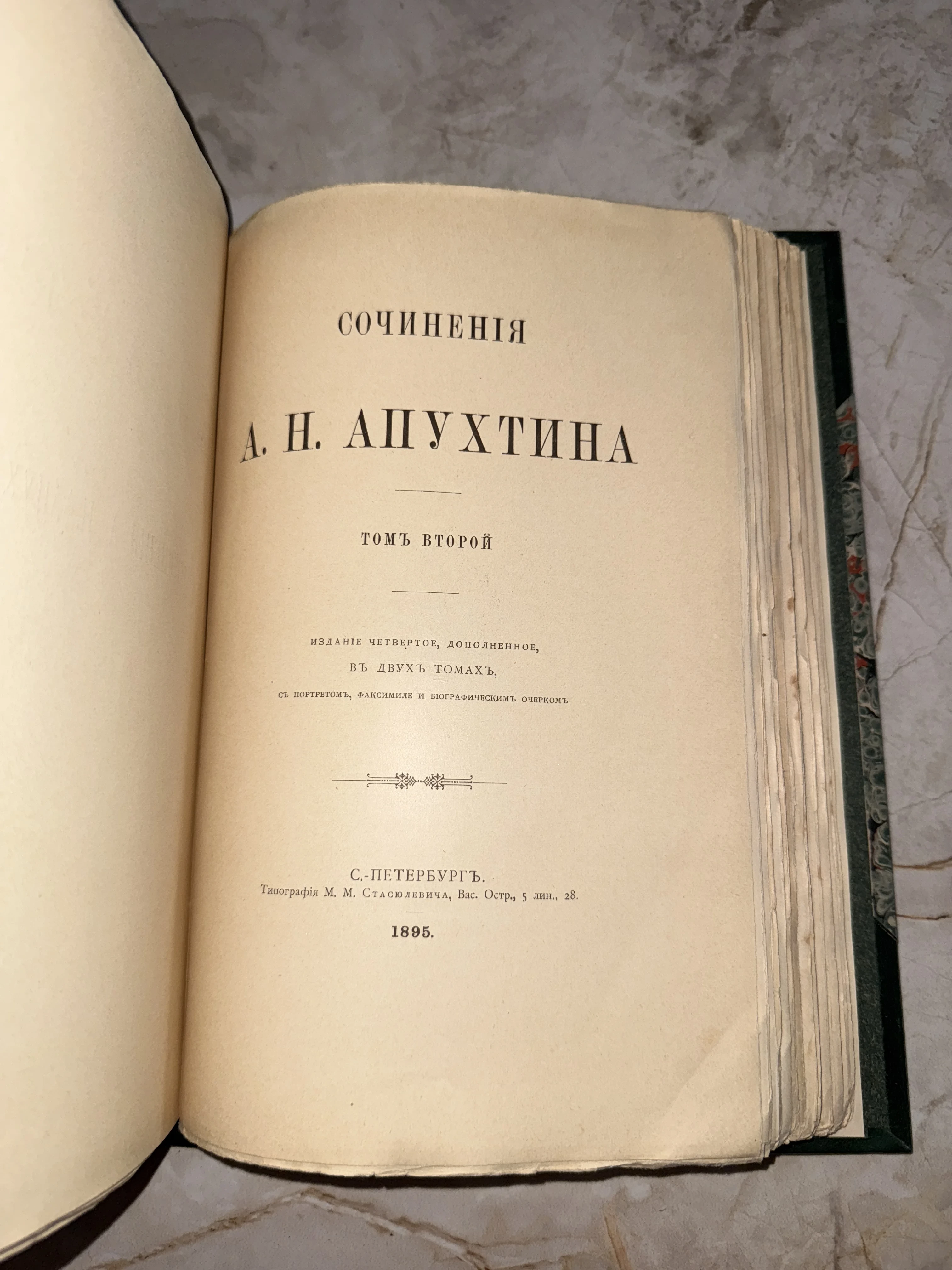 Титульный лист антикварной книги «Сочинения А. Н. Апухтина», изданной в Санкт-Петербурге в 1895 году типографией Стасюлевича.
