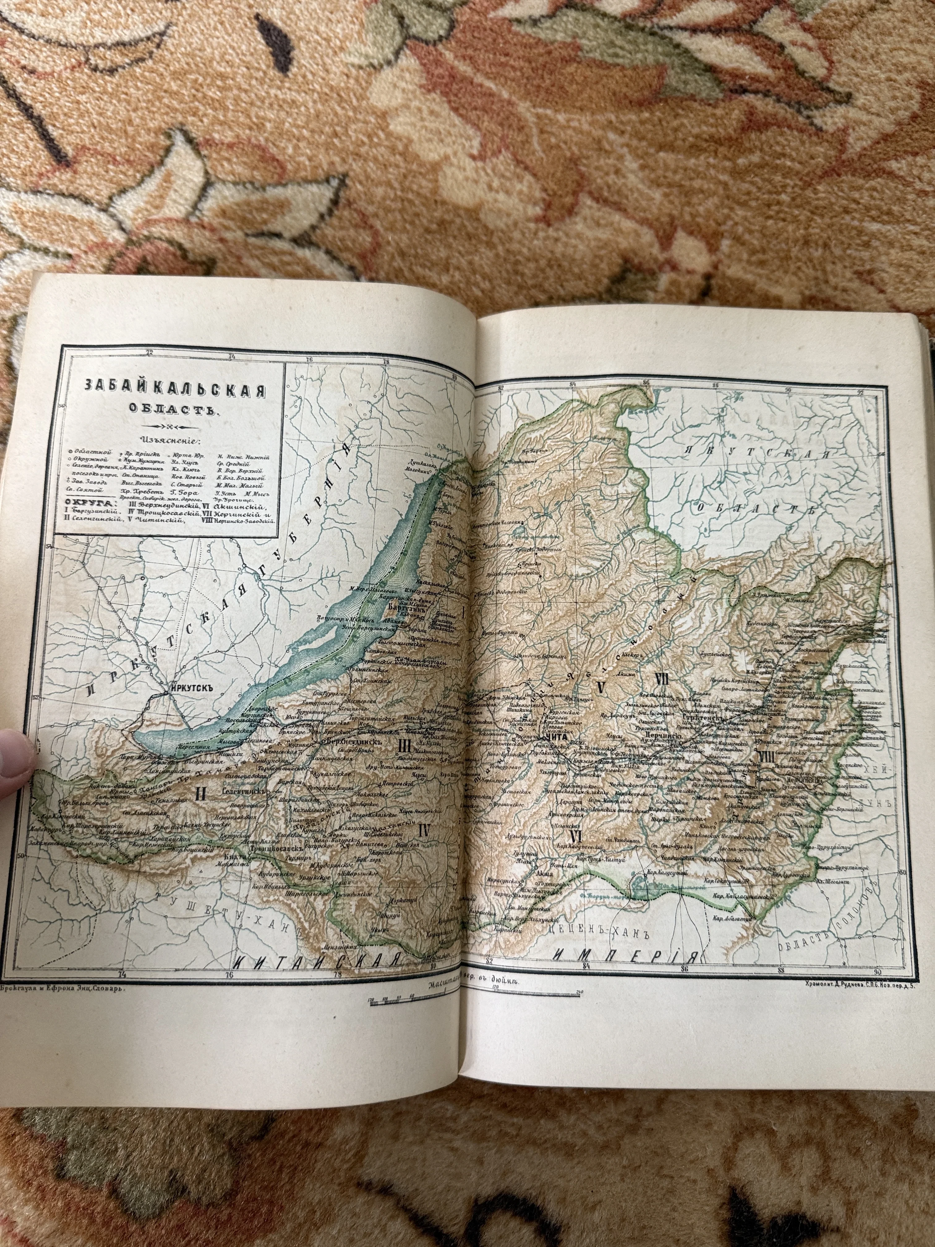 Подлинная литографированная карта конца XIX века, детально отображающая топографию, границы округов и акваторию озера Байкал. Тонкая прорисовка рельефа и использование пастельных оттенков в сочетании с дореволюционной орфографией создают атмосферу подлинного исторического документа. Издание Энциклопедического словаря Брокгауза и Ефрона гарантирует высокую точность и ценность этого картографического экземпляра.