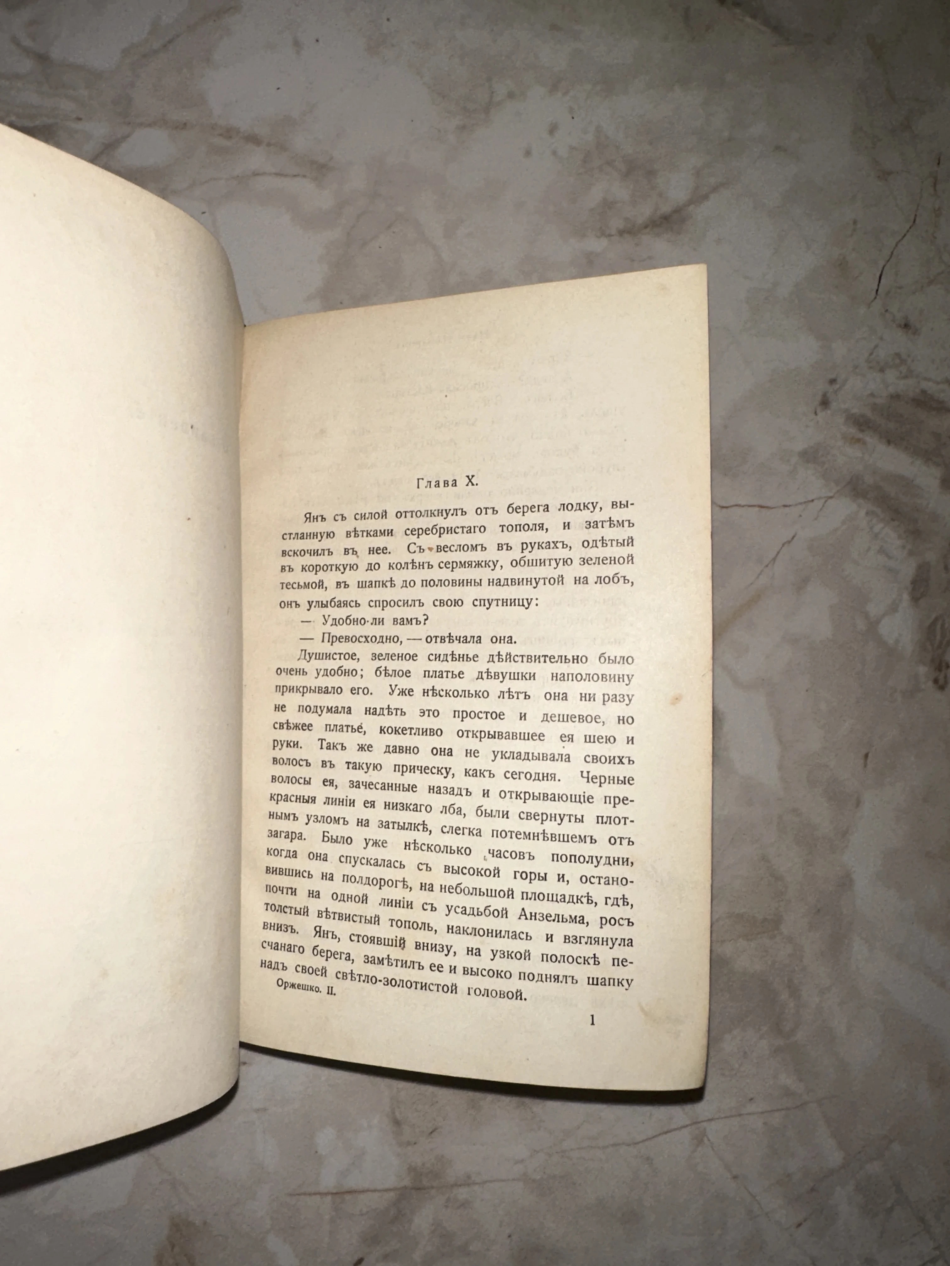 Элегантный разворот антикварной книги с текстом, напечатанным в дореволюционной орфографии. Благородная патина времени на бумаге и четкий шрифт погружают в атмосферу классической прозы начала XX века. Идеальный образец книжного дела, сохранивший дух ушедшей эпохи и тепло старинной библиотеки.