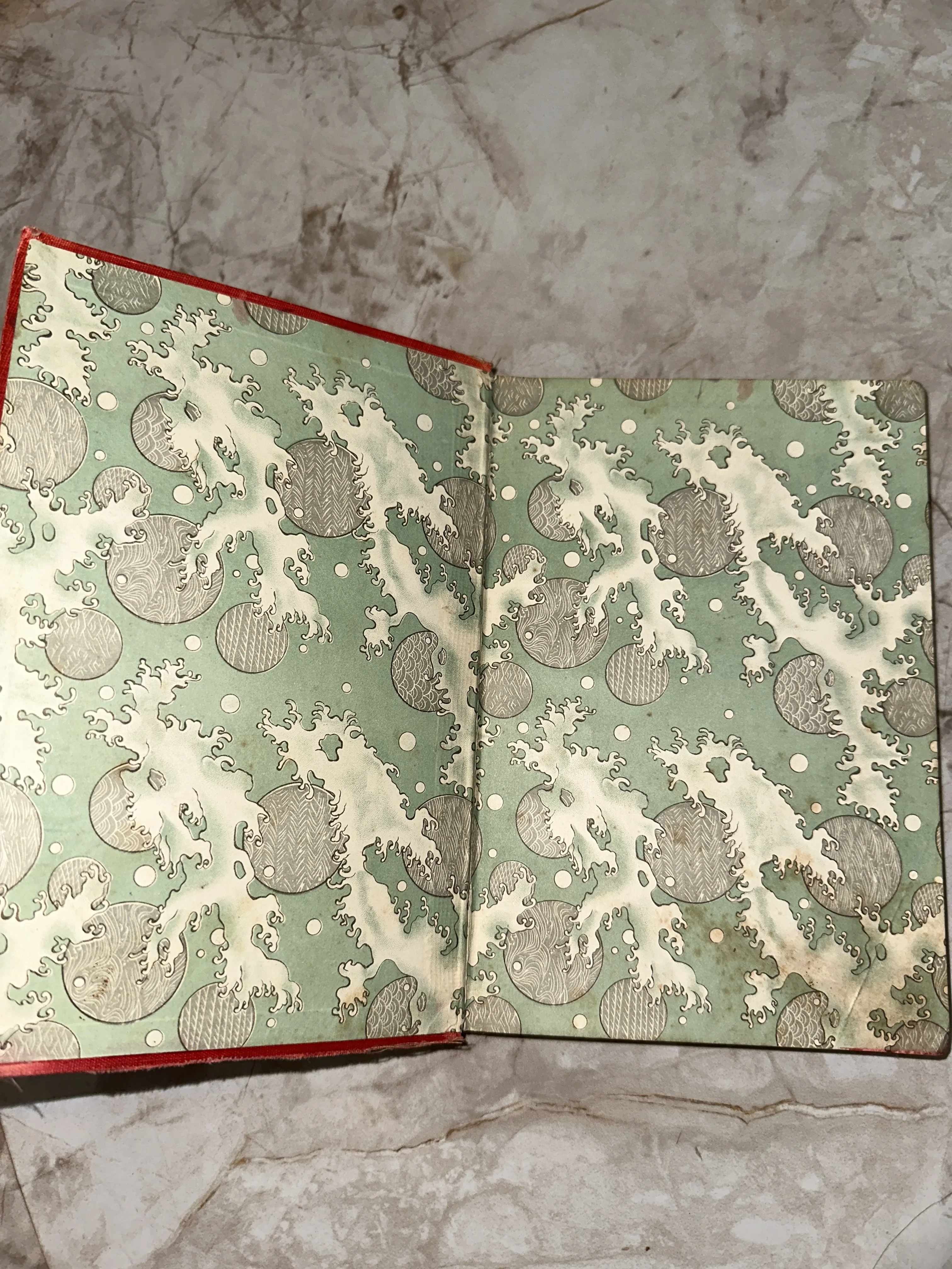 Изысканный форзац, украшенный орнаментом в стиле модерн с явным японским влиянием. Динамичный рисунок морской пены и стилизованных волн на нежно-зеленом фоне создает атмосферу эстетического спокойствия. Благородная патина времени на бумаге подчеркивает коллекционную ценность и уникальность данного переплета.
