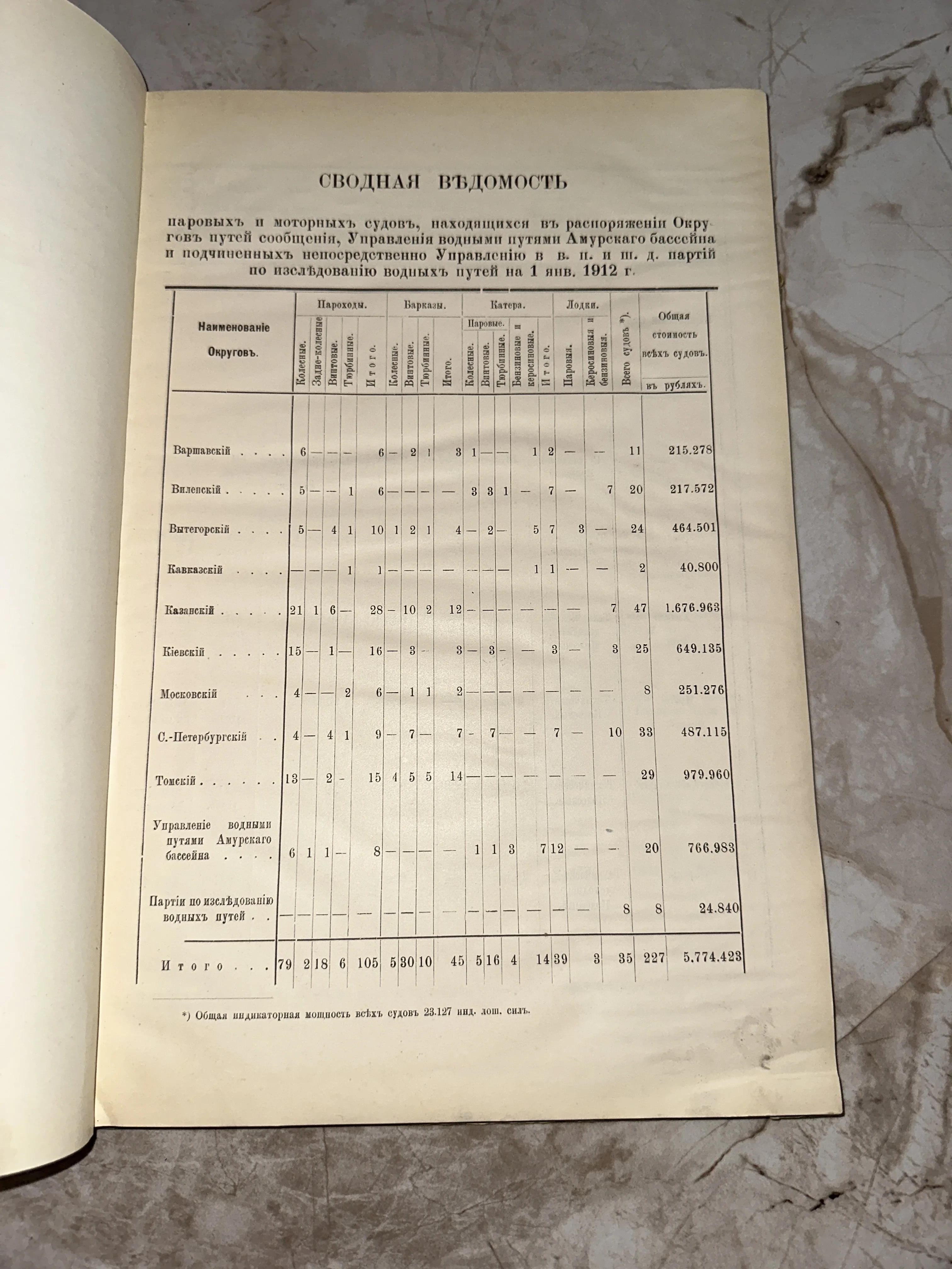 Уникальный образец дореволюционной деловой документации, содержащий подробную статистику речного флота от Варшавского до Томского округов. Страница из редкого ведомственного издания сохранила благородную патину времени и четкость типографского шрифта начала XX века. Идеальный артефакт для коллекционеров, интересующихся историей транспорта и промышленным развитием Российской империи.