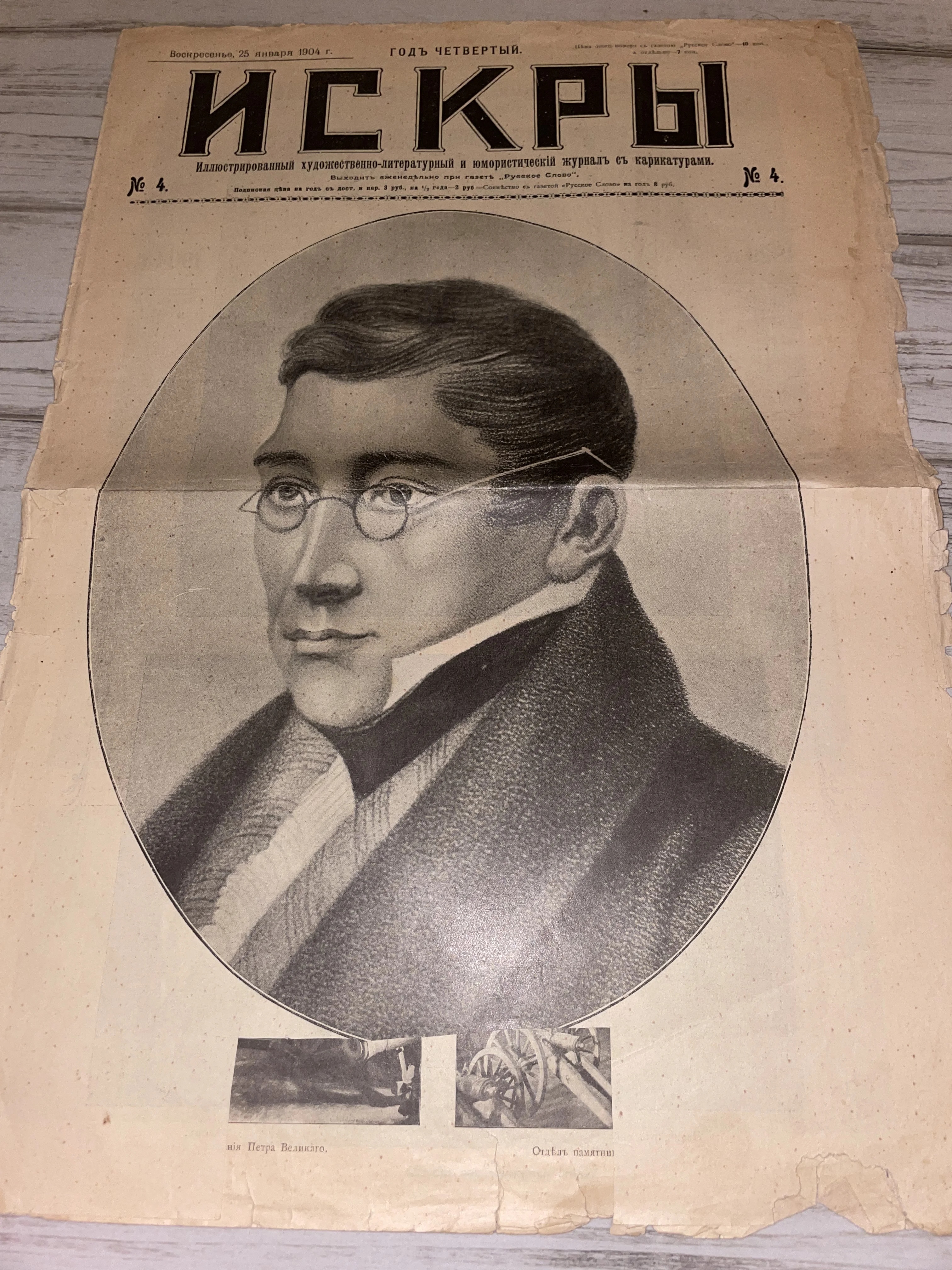 Обложка антикварного журнала «Искры» 1904 года с крупным портретом мужчины в очках и иллюстрациями пушек внизу.