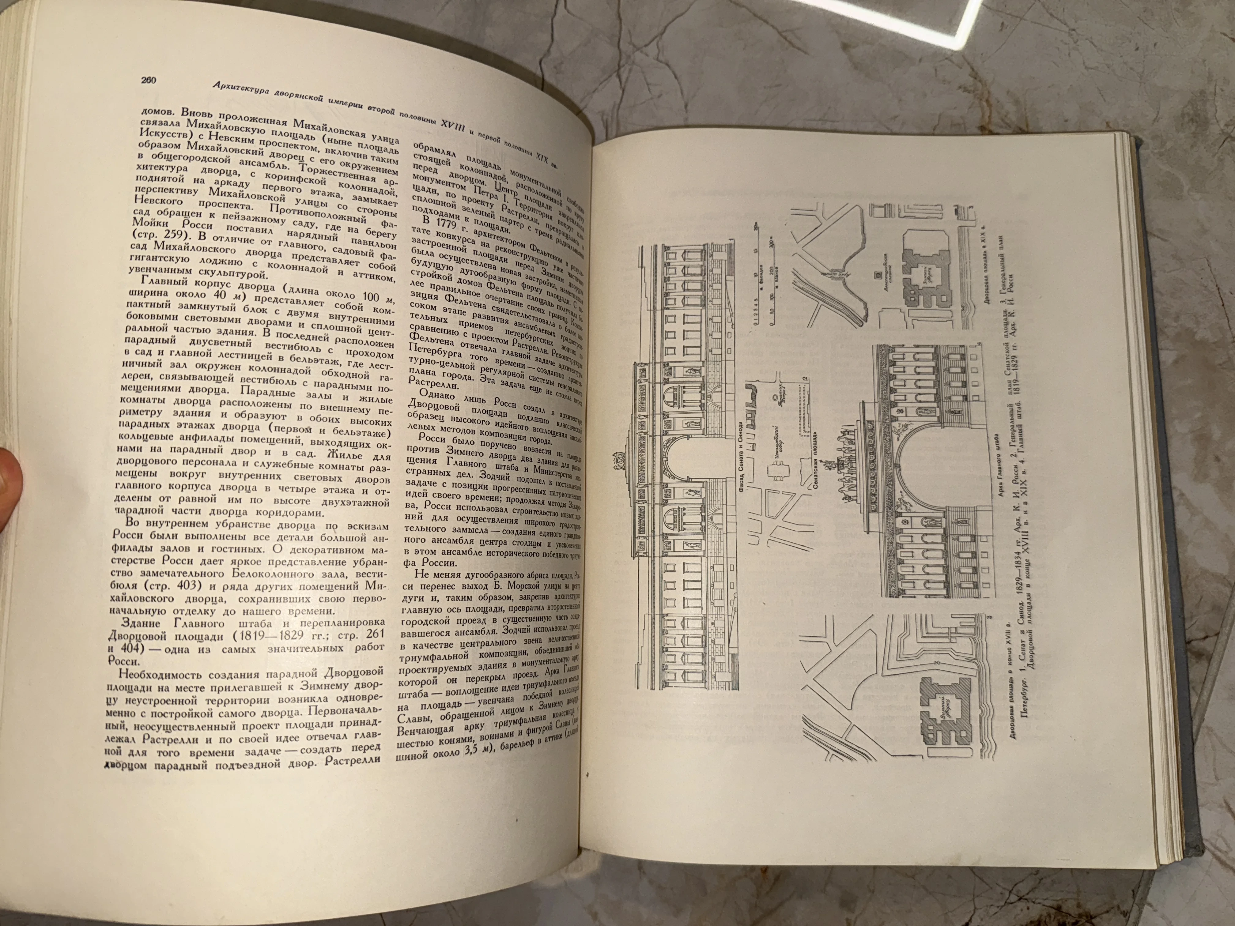 Этот разворот из научного издания посвящен градостроительному гению Карла Росси и застройке Дворцовой площади. На страницах представлены детальные чертежи фасадов и генеральные планы, позволяющие проследить эволюцию архитектурного облика имперского Санкт-Петербурга. Прекрасный образец профессиональной литературы для коллекционеров и исследователей классицизма.