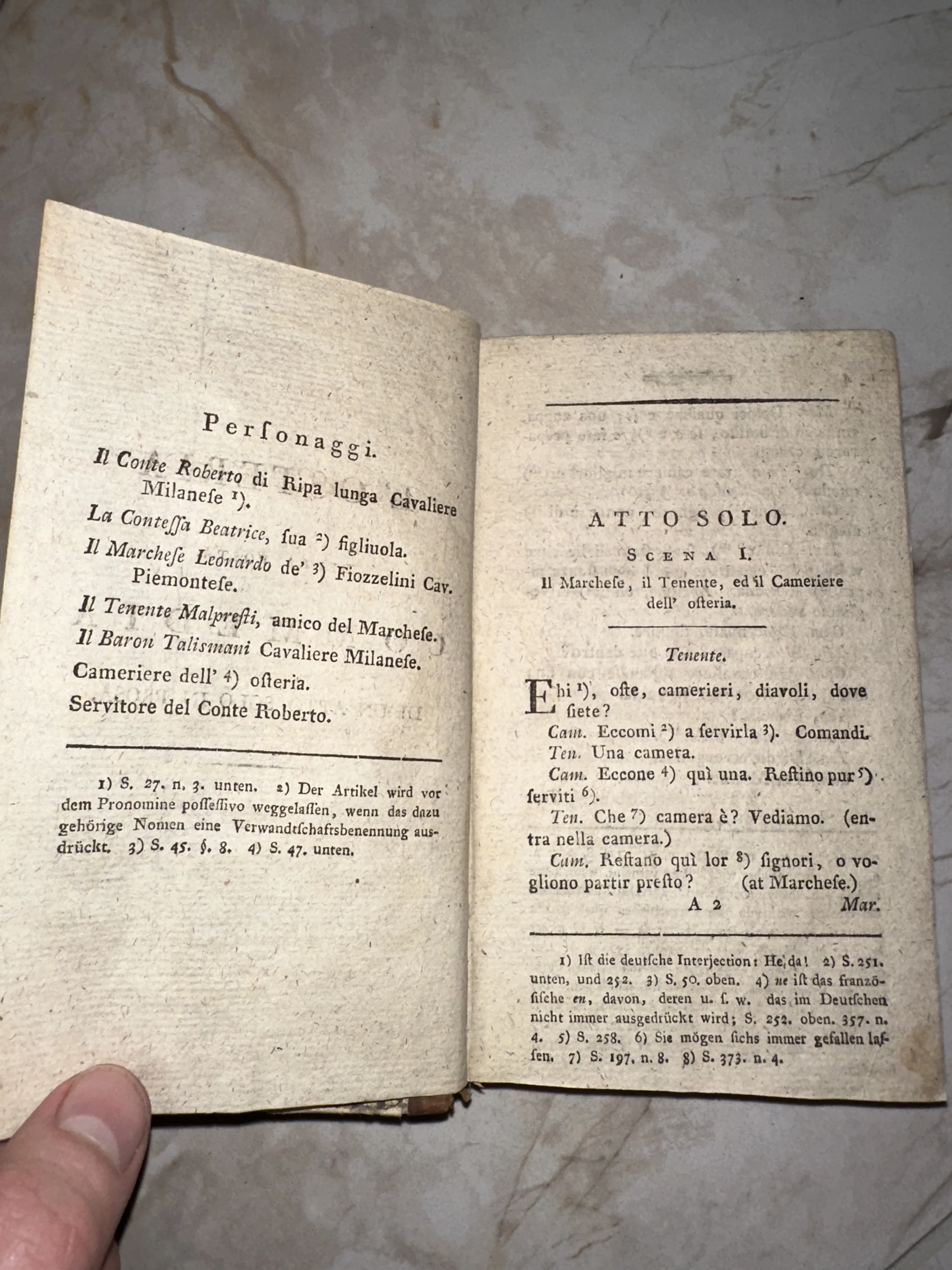 Перед вами уникальный разворот антикварного издания, представляющий начало театральной постановки с детальным списком персонажей. Пожелтевшая бумага с характерной фактурой и четкий типографский шрифт передают подлинную атмосферу европейского театра прошлых столетий. Особую ценность экземпляру придают двуязычные примечания, свидетельствующие о богатой истории бытования книги.