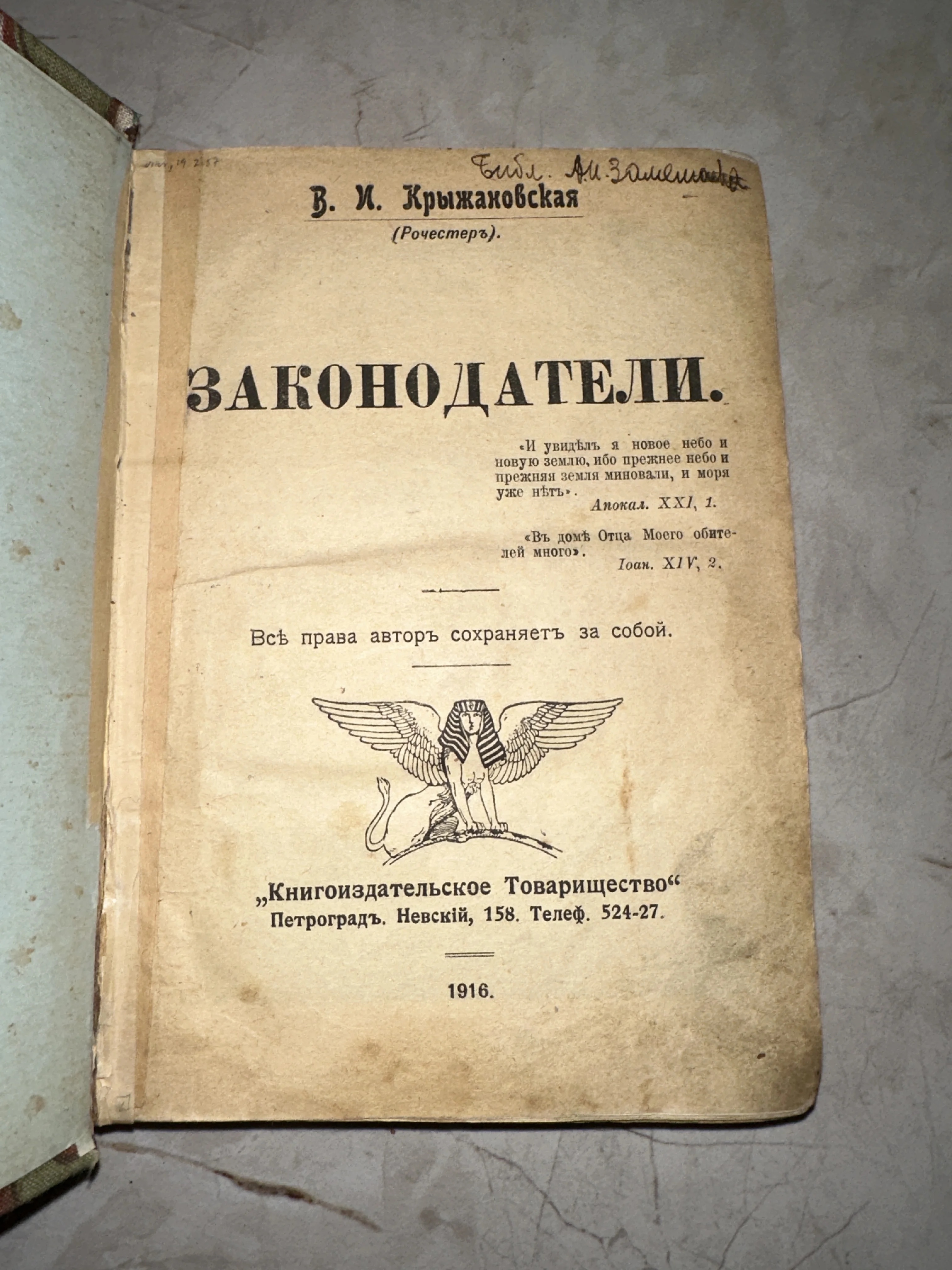 Титульный лист антикварной книги Веры Крыжановской «Законодатели», изданной в Петрограде в 1916 году.