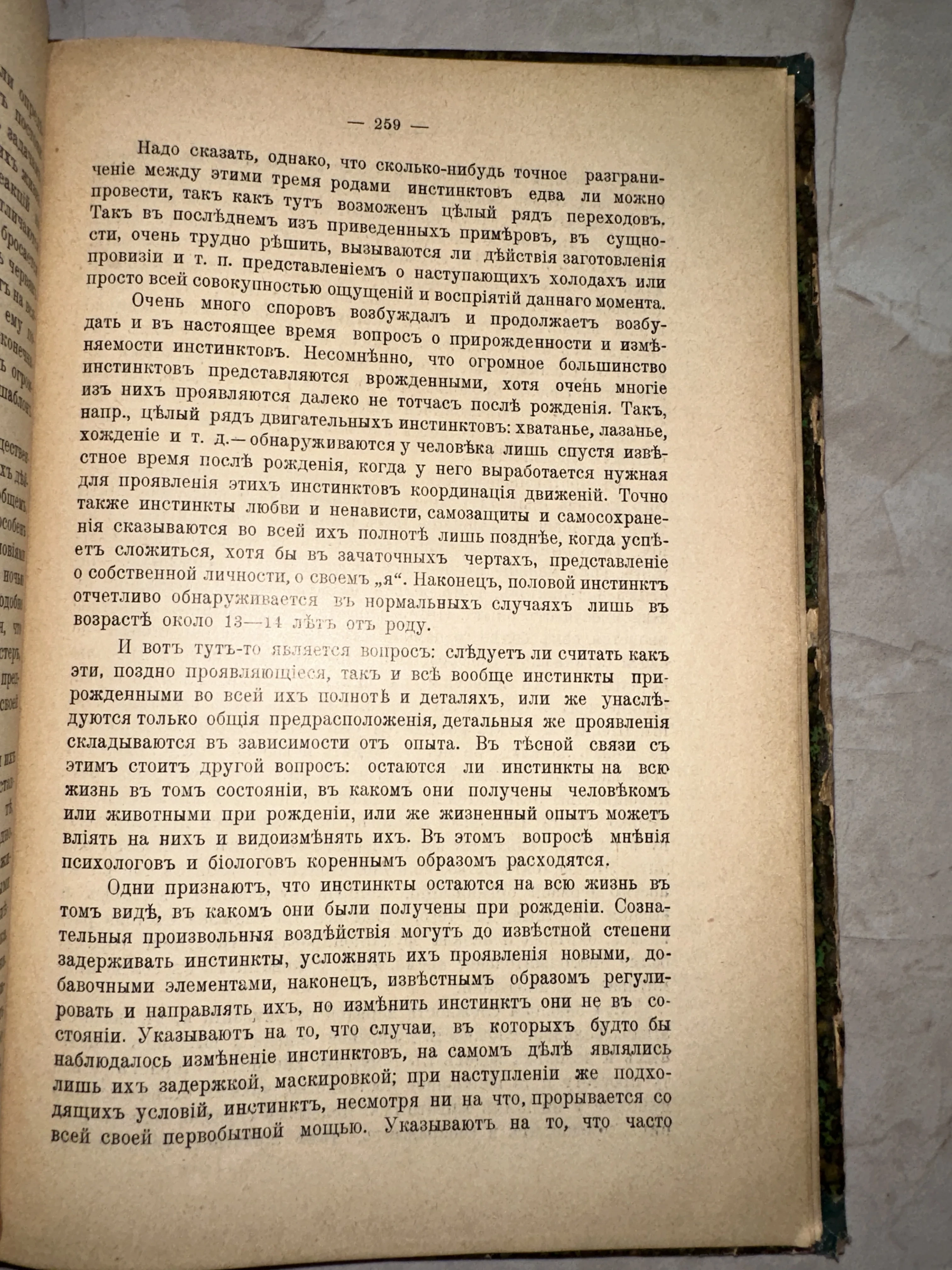 Страница номер 259 из старинной книги с текстом на дореволюционном русском языке, посвященным психологии и биологии инстинктов.